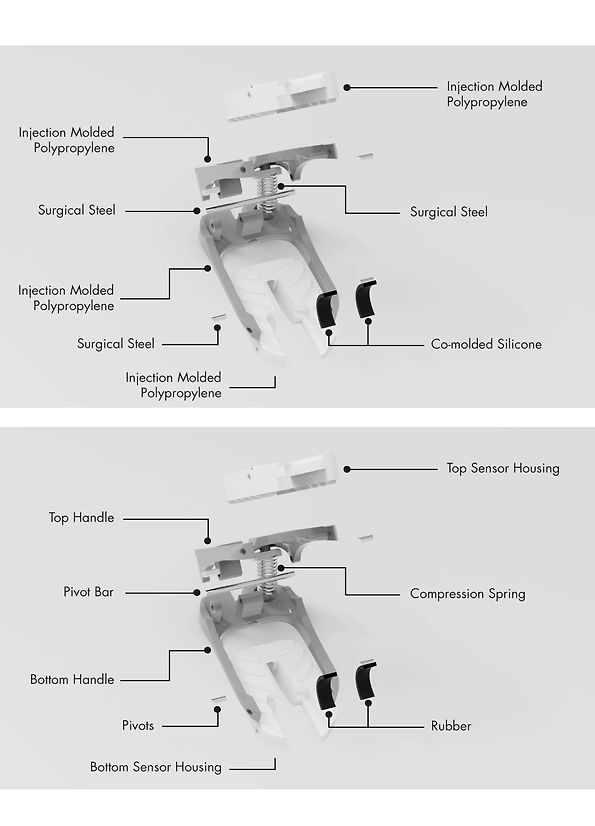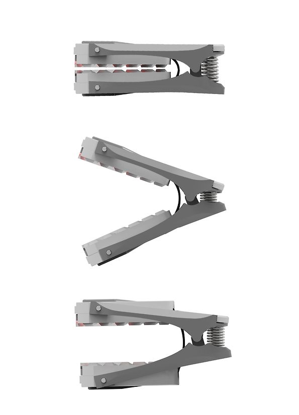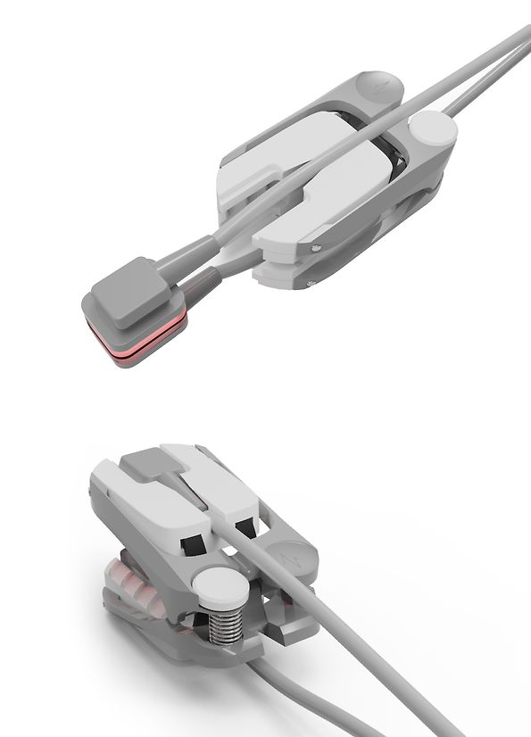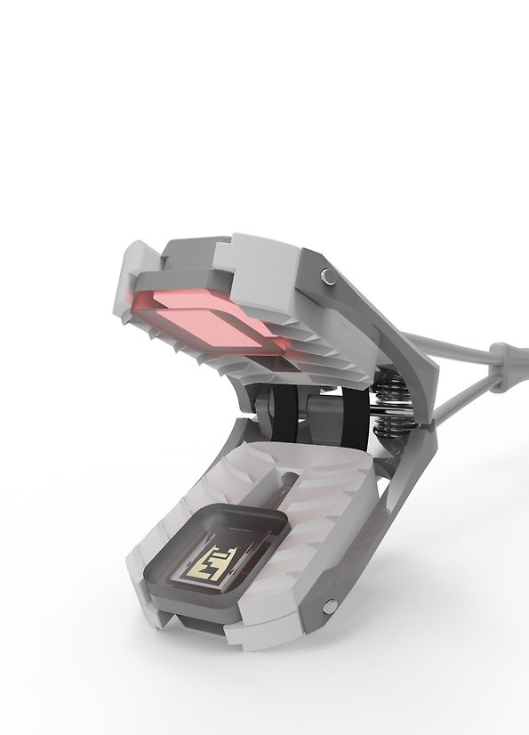 PulseOx delivers low pressure secure attachment, allowing blood to flow freely and minimising the frequency of pulse oximeter failures and detachment for veterinary application. This was achieved through careful detailing of the top and bottom sensor housings to improve grip across a range of textures and saliva levels. In addition, front pivoting these sensor housings, allowed these elements to float, improving surface contact, and importantly reducing clamping pressure and simultaneously improving monitoring response.