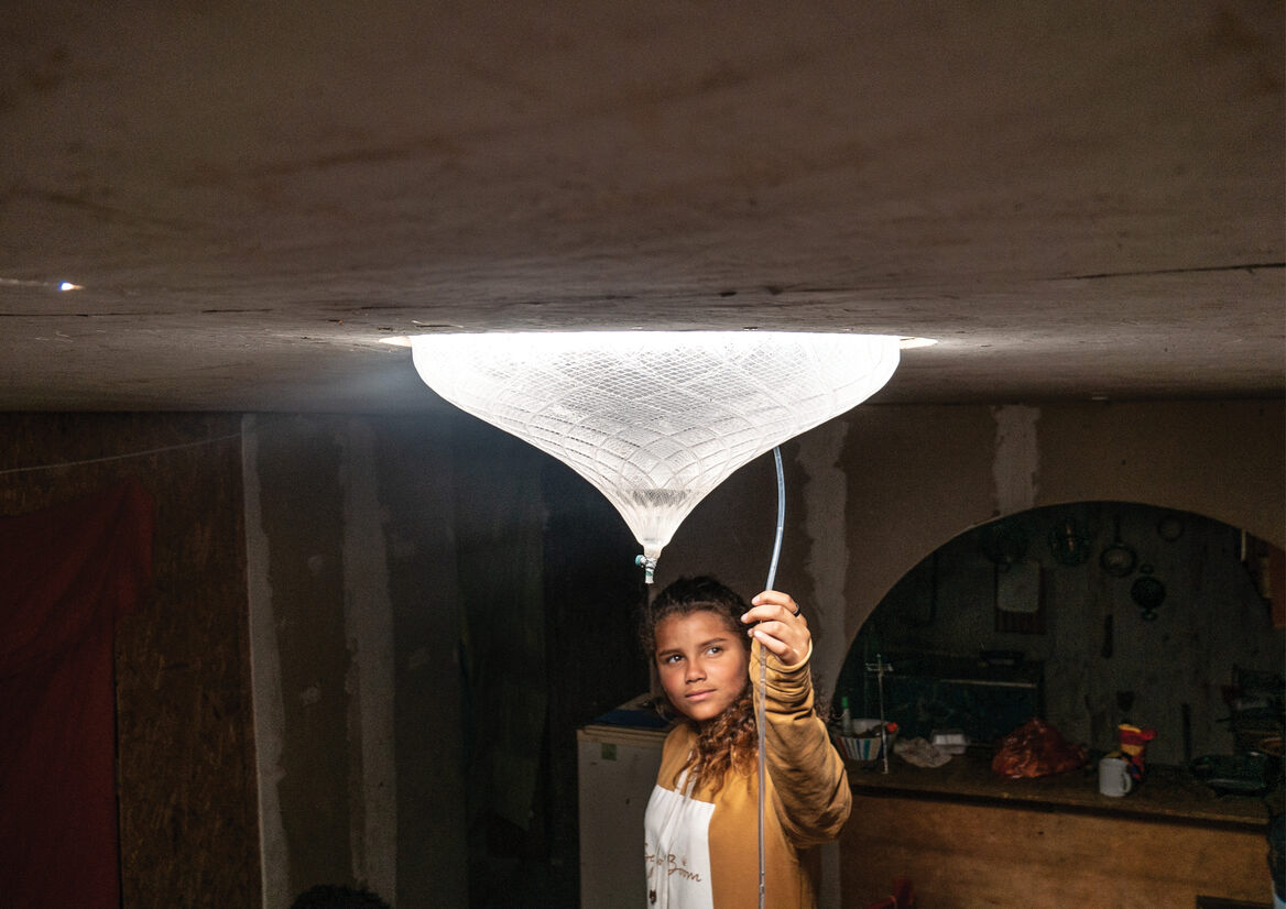 It was important that these processes could be understood in an approachable and accessible way. The idea of incorporating the hybrid skylight within the living environment meant that the design could offer more than just resource production, but would also offer an aesthetical engagement through the qualities of performing as a skylight. During the desalination process, the water and natural light combines to create a soft ambience and dappled effect inside the often dark and boarded up homes. The diffused natural light provides a well-lit workspace and social area for the family, while reducing their reliance on electrical systems.