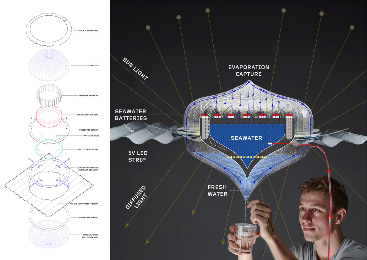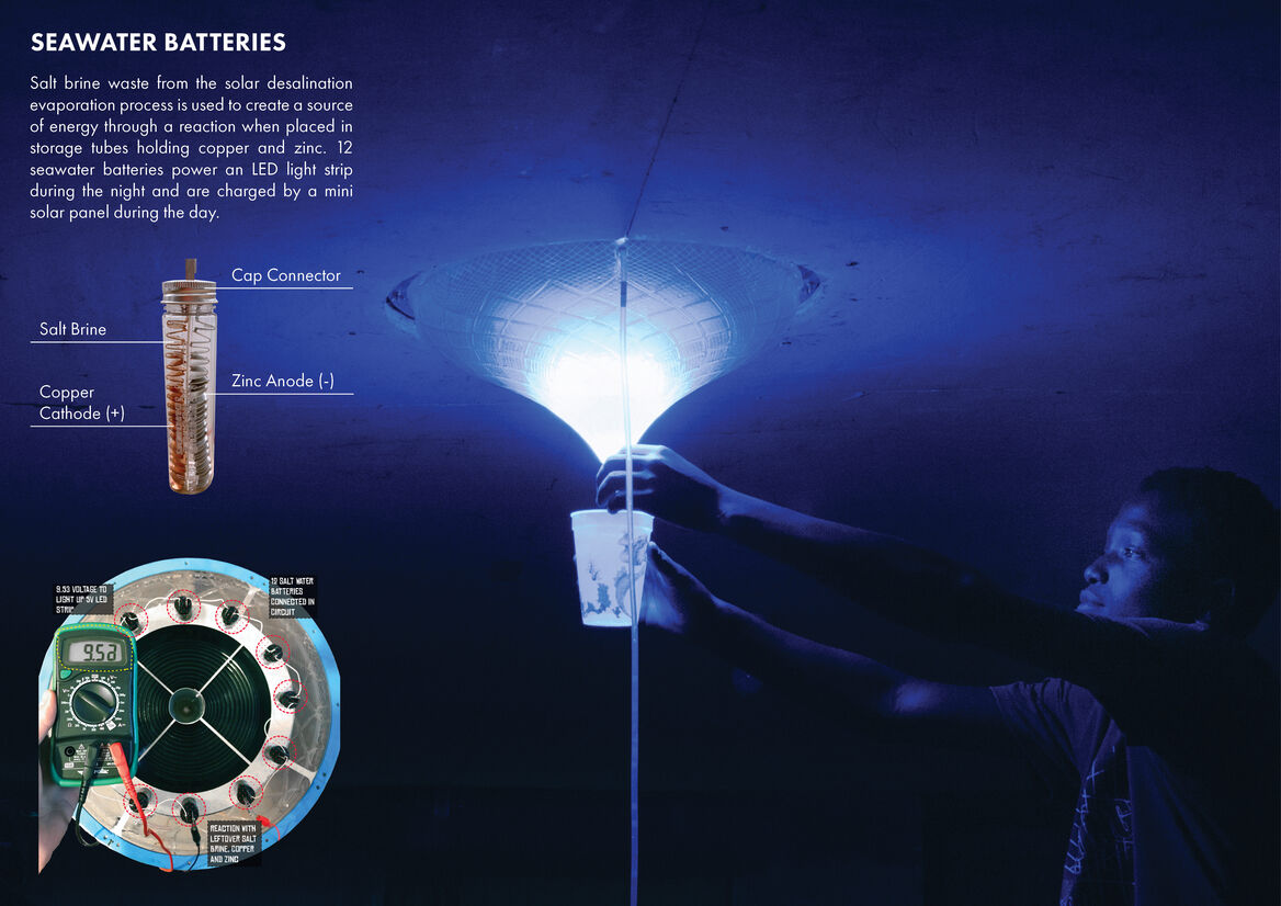 Through a collaboration with a local Chilean NGO called TECHO, the Solar Desalination Skylight is currently being used within the coastal informal settlement community called ‘Nueva Esperanza’ in Mejillones. The design takes a holistic approach to providing Nueva Esperanza with essential resources, by harnessing the environments abundant solar energy and seawater. The Solar Desalination skylight emits a natural diffused light, produces drinking water, and utilises leftover salt brine for energy creation. Circularity was a fundamental design principle, where waste outputs, became a resource opportunity. A highlighted example is how the design utilises the salt brine waste from the evaporation process to create a series of salt batteries. This provides a source of energy through a chemical reaction when placed in tubes holding copper and zinc. These 12 seawater batteries could power a LED light strip during the night and are charged by a mini solar panel during the day.