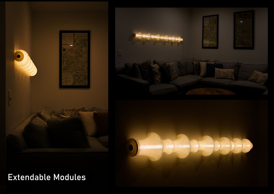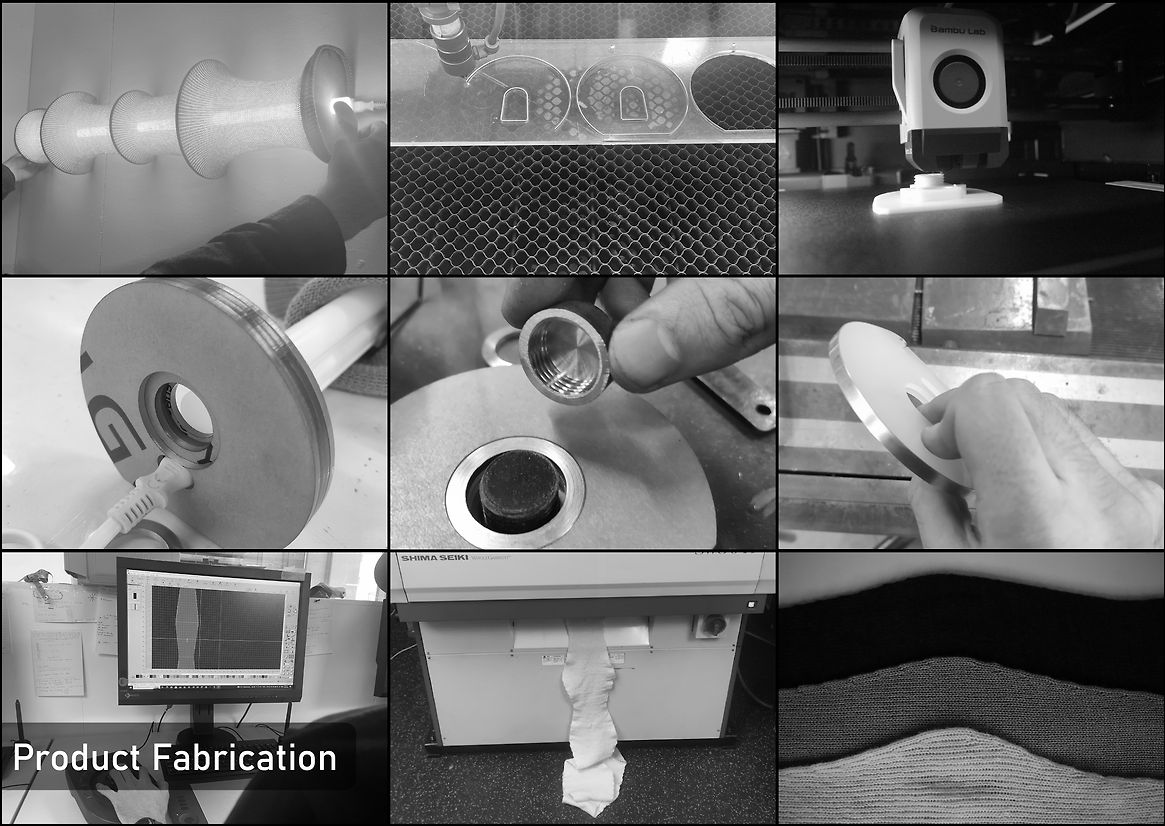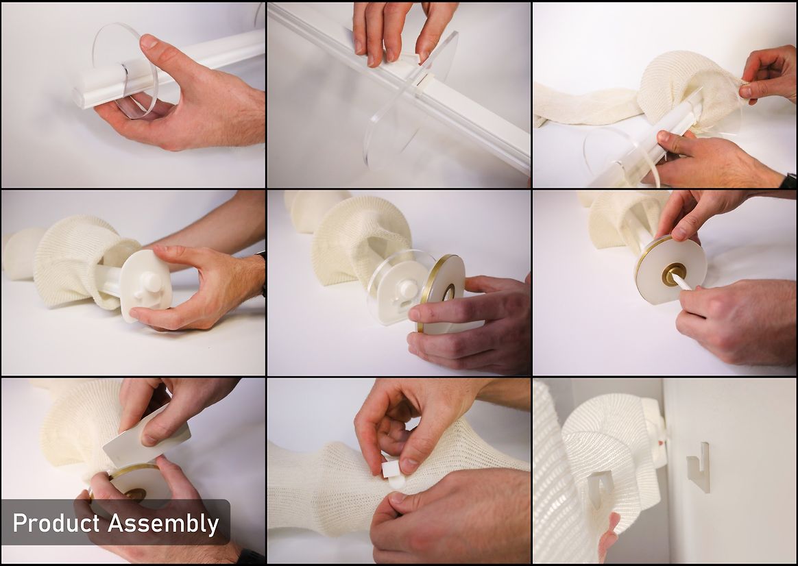 Laser cutting was used in creating clear acrylic contours that give structure for the knitted textiles to form around. The use of clear acrylic allows for the final light to appear as a floating design. 3D printing was used to create clips and caps that allowed for minimalist ways to secure all the elements together to assemble the final light structure. To enhance the luxury appeal of the light further, brass was incorporated into the end caps. Radiance's final structure is easily mounted onto any wall space with discreetly designed brackets. The design is also modular, allowing it to be configured to create longer lighting fixtures.