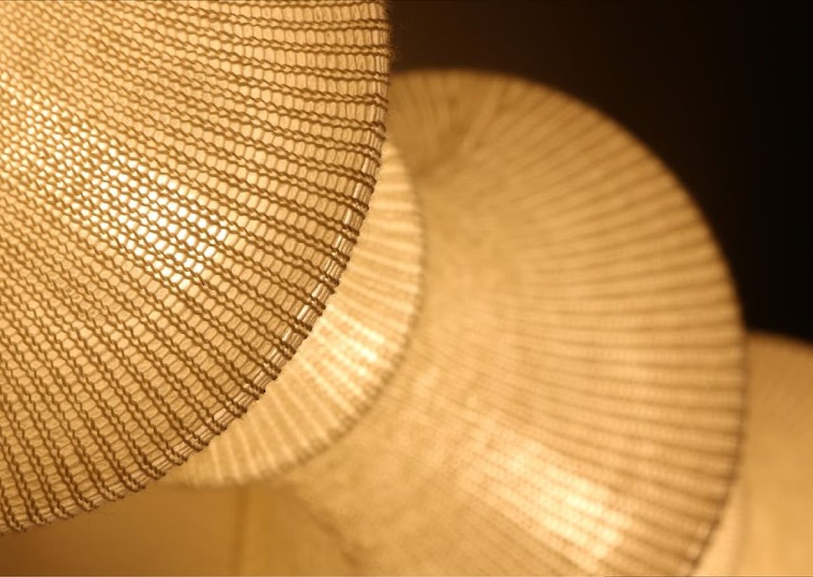 The design leverages the properties of digitally knitted textiles, creating a product that is easy to manufacture and assemble, while also demonstrating the form knitted textiles can create. The knitted sleeve is created using strong wool yarn, ensuring thicker fibres that diffuse more light compared to other yarns.The shape of the knit sleeve was programmed using the digital knit software. This was where I designed the overall shape of the knitted textile to match the varying contours throughout the structure. Doing this resulted in a more dramatic webbing effect.