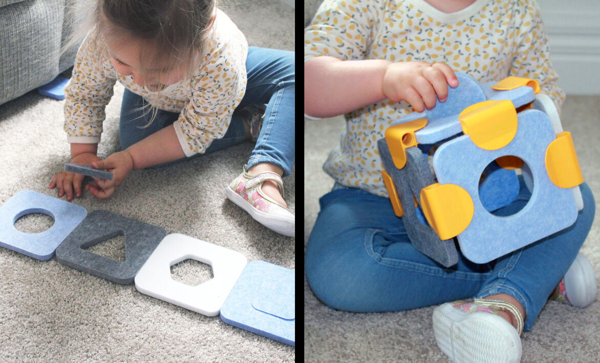 Shape Shifter consists of four different coloured panels with geometric shapes to fit into them, five different types of interlocking connectors, and a wheel component that can be inserted into the connector pieces to encourage more complex building and explorative play.