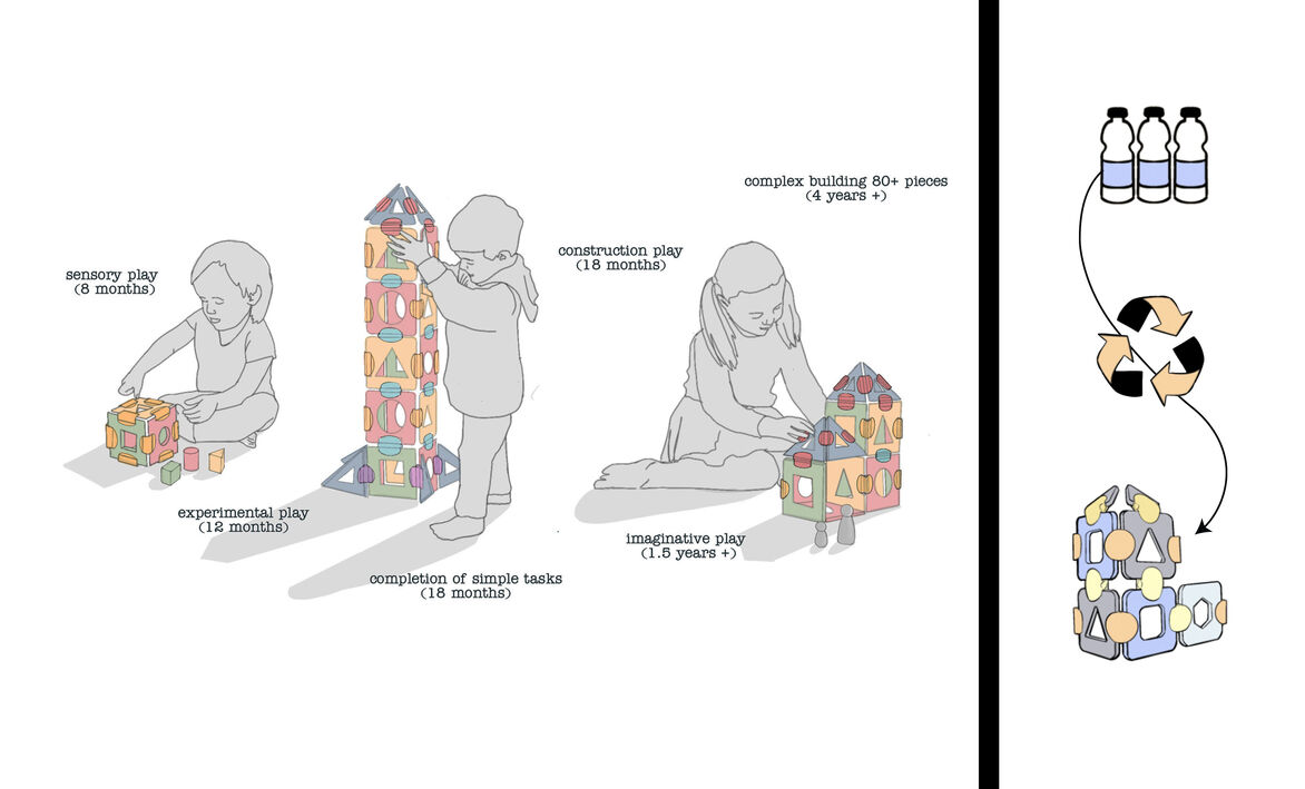 The judges really enjoyed the engaging and playful construction system as well as the commitment to incorporate recycled materials into the manufacturing processes. The judges praised the way the design was easy for kids to handle and obviously ticked the fun to play requirement of any toy. A well thought through and test projected.