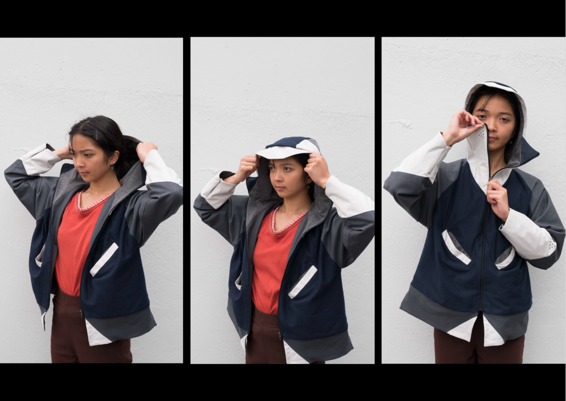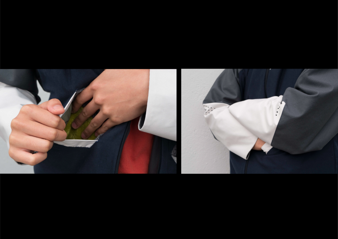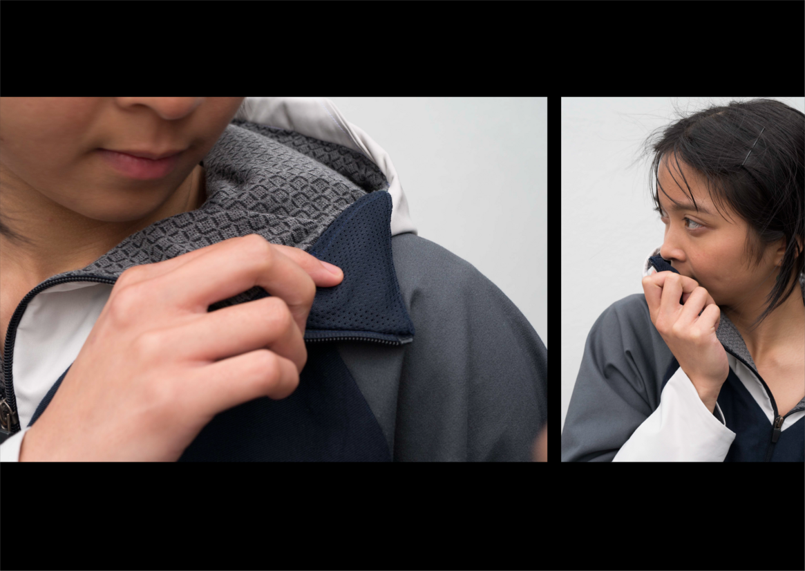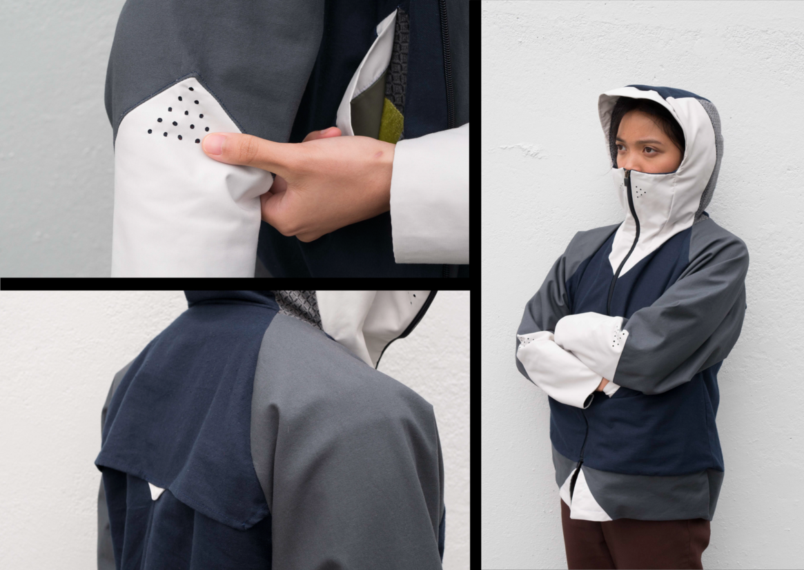 BenifiSense addresses this by catering for the senses in a discrete and non-disruptive way, allowing the user to interact with the jacket when and how they want, depending on their individual sensory needs. BenifiSense is user-centric and is highly sensitive to the uniqueness presented in SPD. Interactive elements of the jacket are coloured white (associated with peace and clarity), to serve as a visual cue to the user. The hood regulates sound, using damping foam layered under a sound blocking polyester outer shell. Slots inside the hood allow the Bluetooth speakers to be inserted and adjusted to mask unwanted noise. The soft visor can be folded out to protect from harshly lit environments. Scented bead pouches can be inserted into the pockets inside the mouth-covering, minimising triggering smells and odours. They can be sprayed with personalised scents that are soothing to the user. The breathing holes of the sleeves serve as a visual cue and reminder to practice the 'Triangle Deep Breathing Technique' when feeling overwhelmed. This motif also features in the back yoke and mouth-covering, indicating areas of breathability. The lining of the jacket minimises the usage of seams that may cause discomfort. Moisture-wicking polyester mesh is used on the panels of the yoke and arms to provide adequate ventilation where it is most needed - areas prone to overheating and sweating when feeling anxious or overwhelmed. The inverted pocket placement allows the user to 'self hug' and apply deep touch pressure on the torso - a practical and effective comfort mechanism when feeling vulnerable and overwhelmed. The pockets are lined with soft velvet. Warm and comforting to the touch, it is reminiscent of a soft toy - a familiar and nostalgic comfort tool. The bottom hem of the jacket features a bead maze, allowing the user to fidget in a discreet and non-disruptive way. The bead is pushed around through the corners of the hem, helping the user focus by providing an outlet for excess stimuli.