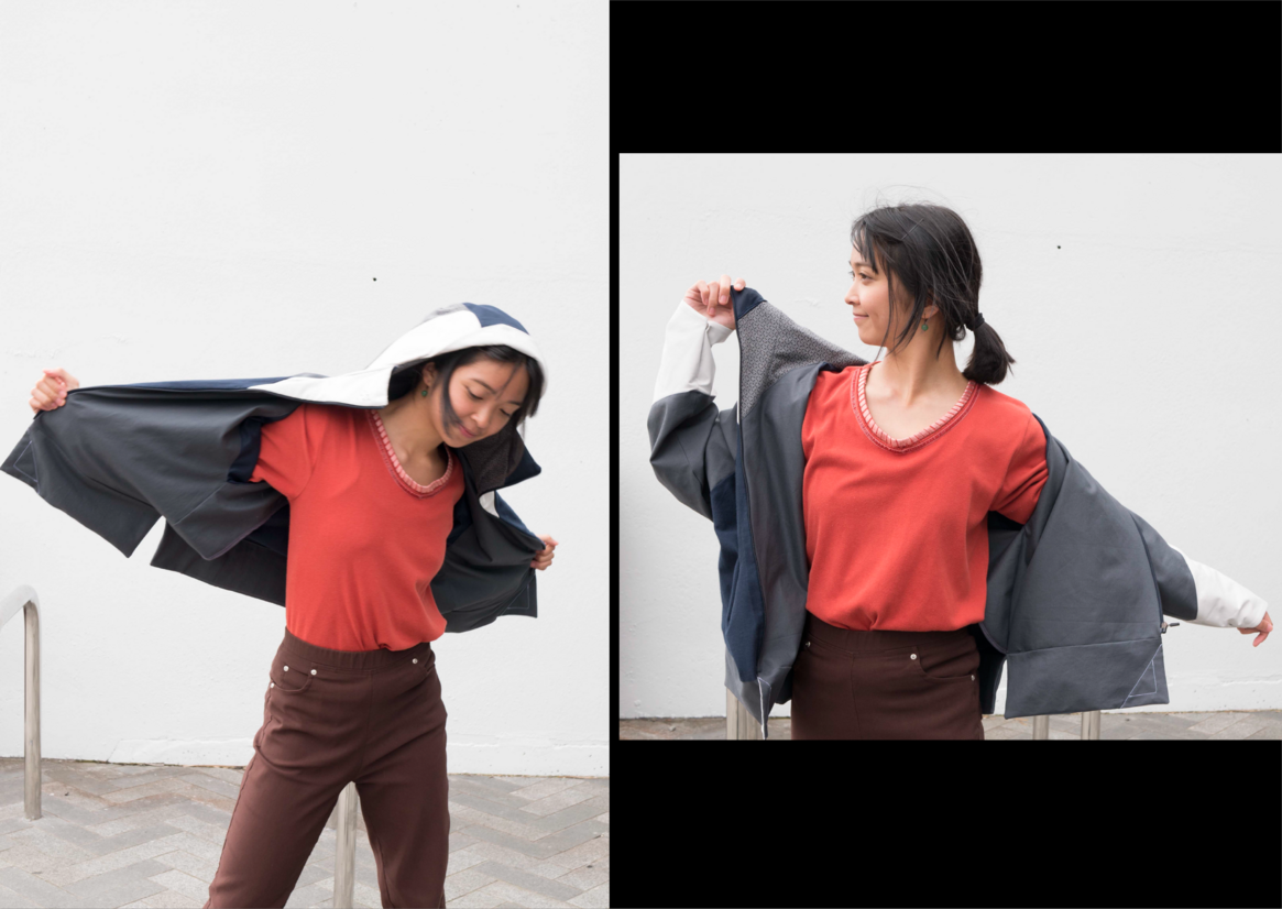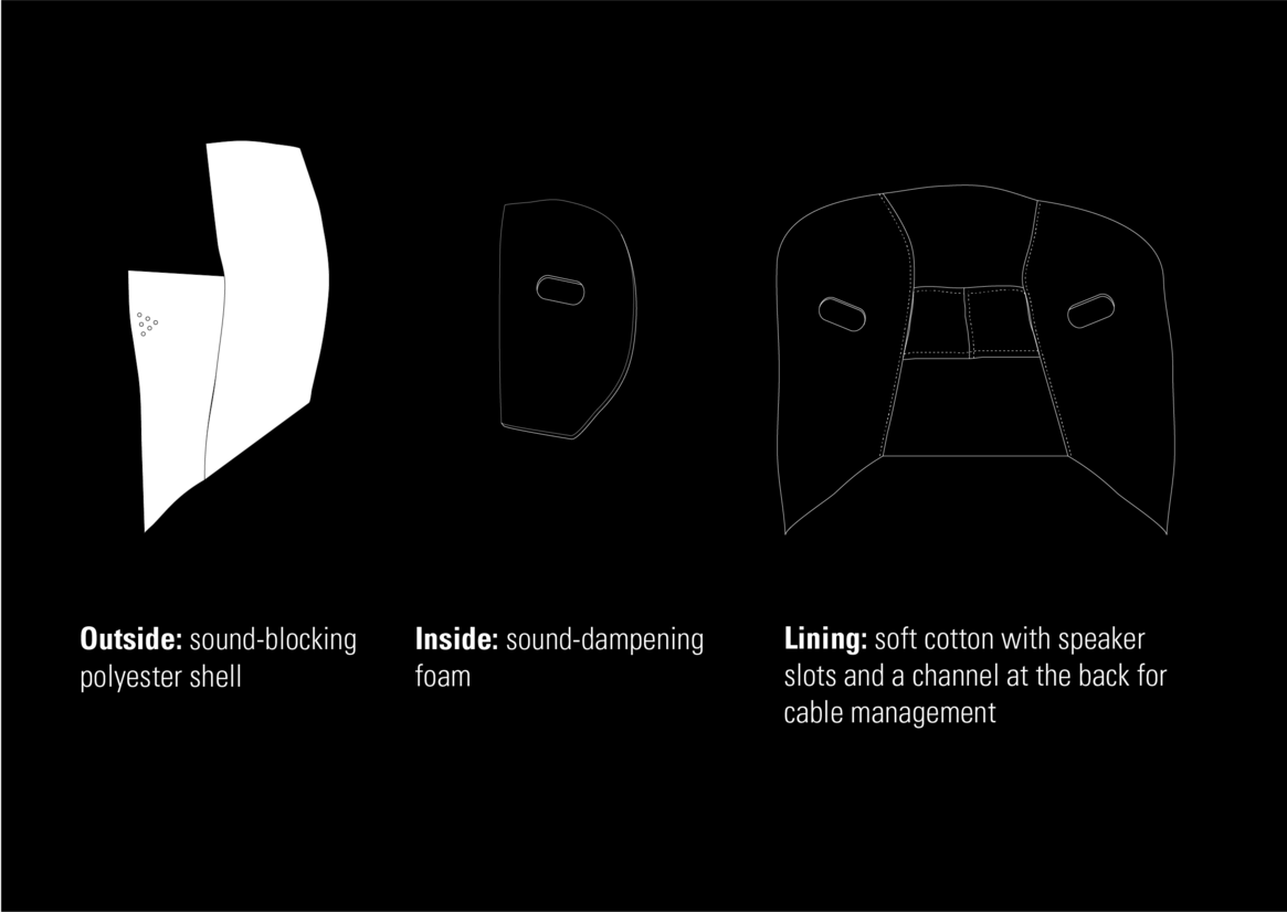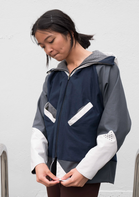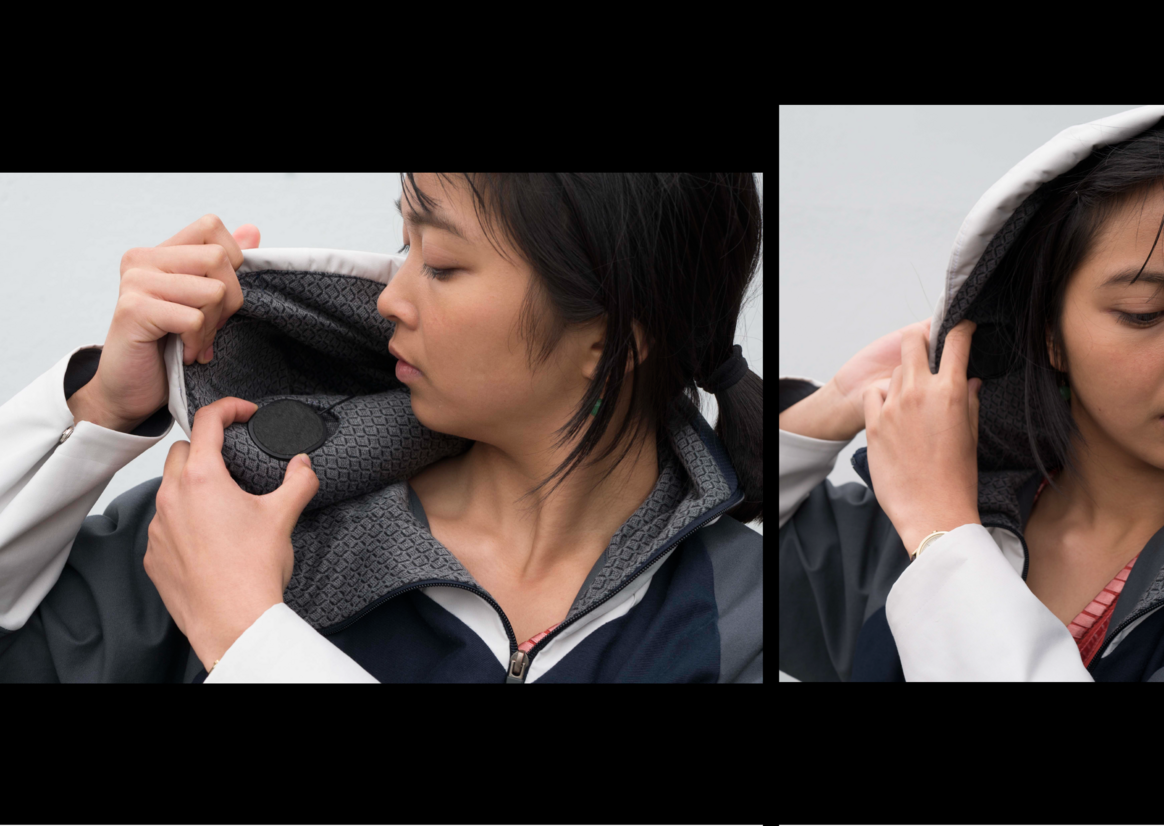 BenifiSense addresses this by catering for the senses in a discrete and non-disruptive way, allowing the user to interact with the jacket when and how they want, depending on their individual sensory needs. BenifiSense is user-centric and is highly sensitive to the uniqueness presented in SPD. Interactive elements of the jacket are coloured white (associated with peace and clarity), to serve as a visual cue to the user. The hood regulates sound, using damping foam layered under a sound blocking polyester outer shell. Slots inside the hood allow the Bluetooth speakers to be inserted and adjusted to mask unwanted noise. The soft visor can be folded out to protect from harshly lit environments. Scented bead pouches can be inserted into the pockets inside the mouth-covering, minimising triggering smells and odours. They can be sprayed with personalised scents that are soothing to the user. The breathing holes of the sleeves serve as a visual cue and reminder to practice the 'Triangle Deep Breathing Technique' when feeling overwhelmed. This motif also features in the back yoke and mouth-covering, indicating areas of breathability. The lining of the jacket minimises the usage of seams that may cause discomfort. Moisture-wicking polyester mesh is used on the panels of the yoke and arms to provide adequate ventilation where it is most needed - areas prone to overheating and sweating when feeling anxious or overwhelmed. The inverted pocket placement allows the user to 'self hug' and apply deep touch pressure on the torso - a practical and effective comfort mechanism when feeling vulnerable and overwhelmed. The pockets are lined with soft velvet. Warm and comforting to the touch, it is reminiscent of a soft toy - a familiar and nostalgic comfort tool. The bottom hem of the jacket features a bead maze, allowing the user to fidget in a discreet and non-disruptive way. The bead is pushed around through the corners of the hem, helping the user focus by providing an outlet for excess stimuli.