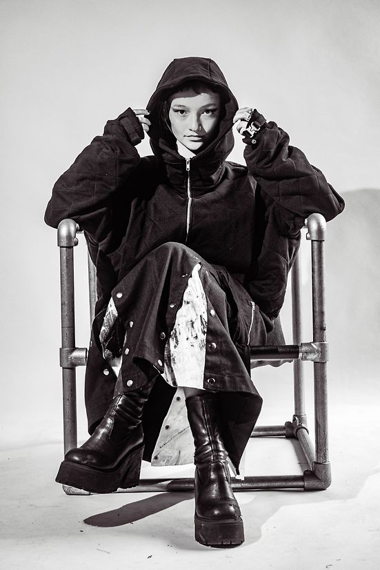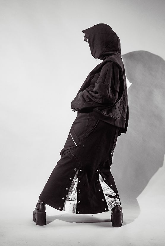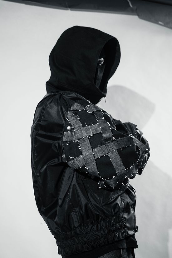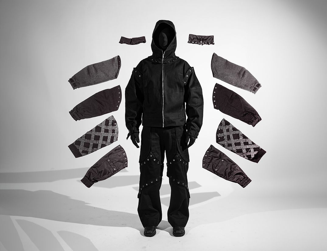 Data entry tackles these problems by focusing on the consumer's wants and giving them the customisation and curation power over the garments, this process starts from the moment they digitally view and inspect the products and their modular components. The consumer can then choose to buy a full garment or the bodices and sleeves separately, they will have a tactile customization process where they attach and swap out modular components to meet the desired look. New attachments and components would be introduced over time with a focus on collaboration with smaller designers and the base patterns for the sleeves, hoods and other elements would be open source allowing consumers to make their own modular components. Rigid workwear-inspired fabrics have been used to provide longevity and allow the consumer to feel comfortable wearing it with everyday wear and tear.