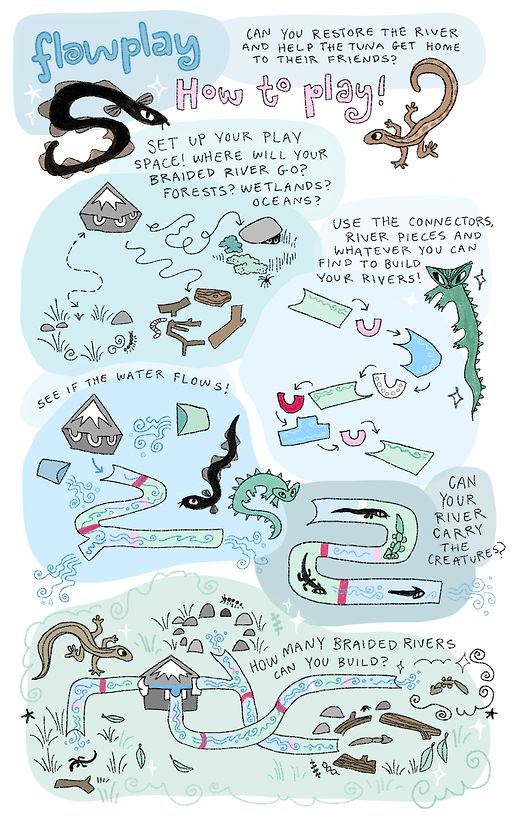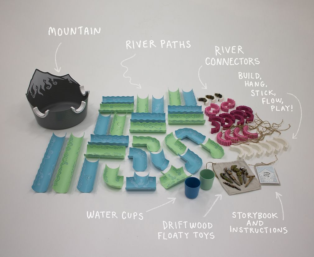 Flowplay is a toy for children aged 6+ that encourages children to learn about Aotearoa's braided river systems through collaborative play. Flowplay encourages children to foster an emotional connection with nature through outdoor play.