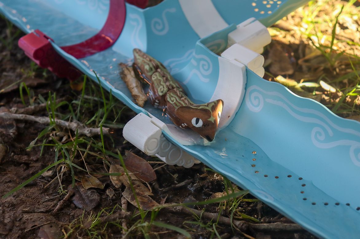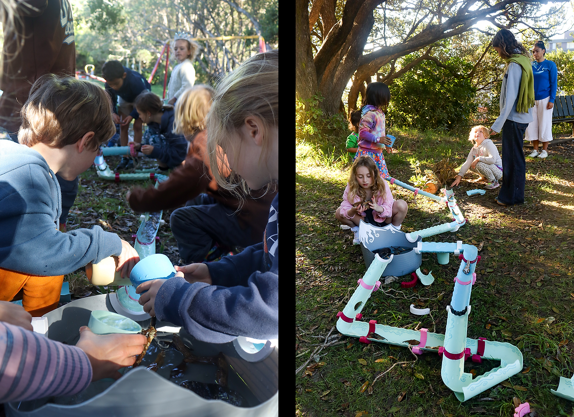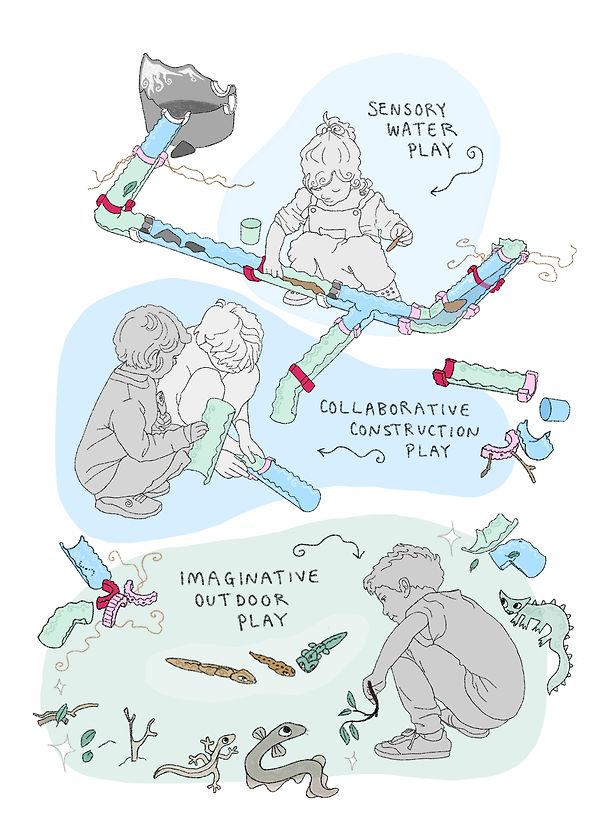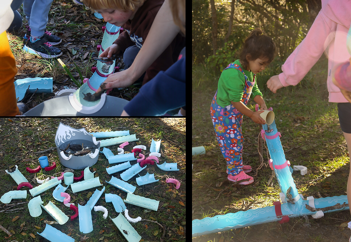 Children forage for materials in the surrounding environments such as sticks to slot into holes in the river connector pieces so they can stand up from the ground and be raised at different heights. String holes allow the paths to be hung from tree branches, bushes or other objects. Holes in the river paths create a challenge that encourages children to use mud, rocks, or leaves to block water from draining out of the holes, fostering tactile and creative play.