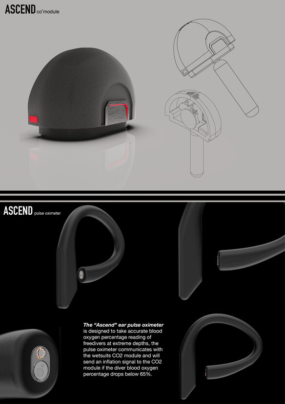 It is autonomously triggered by a pulse-oximeter situated in the diver’s ear called the Ascend Pulse Oximeter, which will produce a high pitch alarm at the time of inflation, to aid in keeping the diver conscious. The wetsuit will inflate autonomously once sensors detect the diver's blood oxygen percentage drops below a 65% threshold.