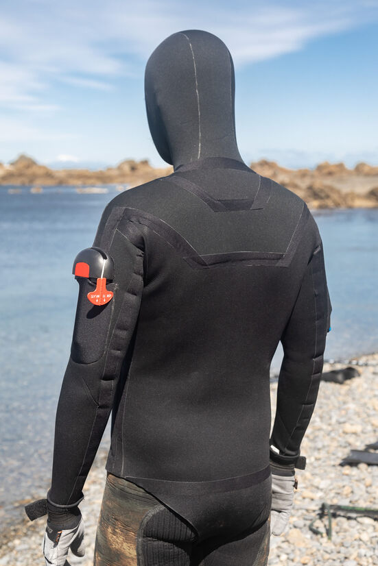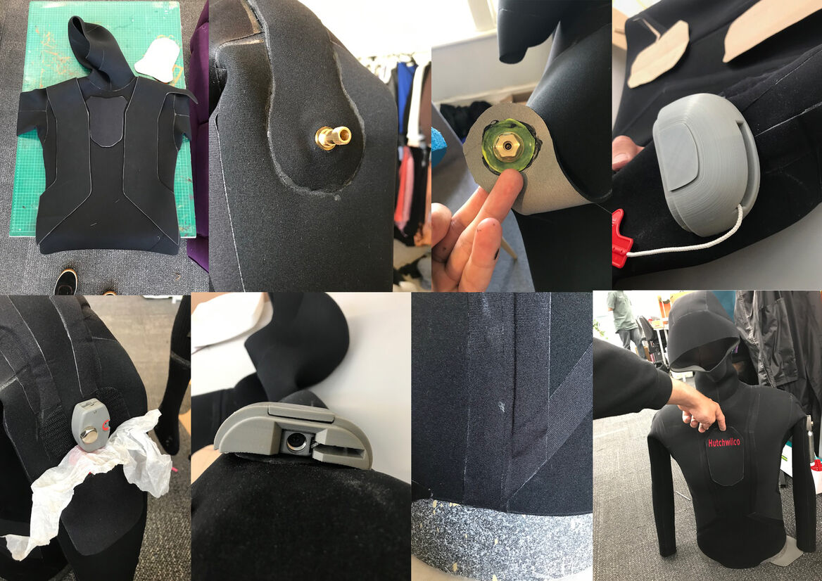 What I came up with is the Hutchwilco Ascend, a spearfishing wetsuit containing an inflation bladder that connects to a CO2 module located on the shoulder, which is injection moulded out of recycled high-impact rubber.