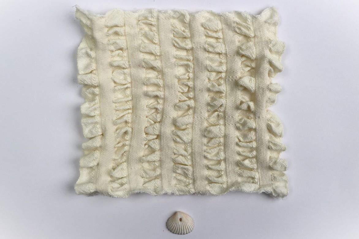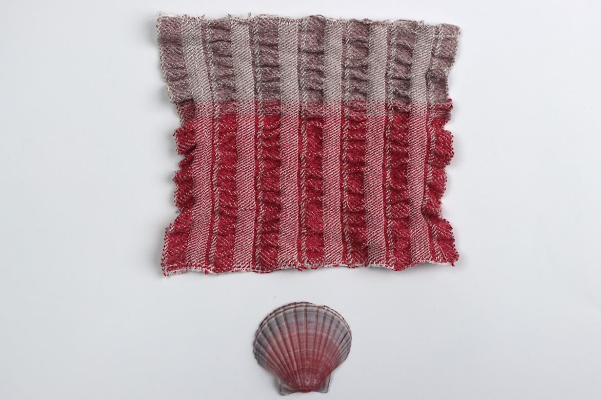 Using techniques such as double cloth, collapse weave, warp rib, and curved twill, I recreated shell characteristics in textile form. High-twist yarns were used to form ridges, echoing the textures of cockles and fan shells. In other samples, hand-painted warps brought the softer tones and shapes of shells like the ostrich foot to life. Through the structure of double cloth, I represented the shell’s strong, outer surface contrasted with its smooth, pearlescent interior.