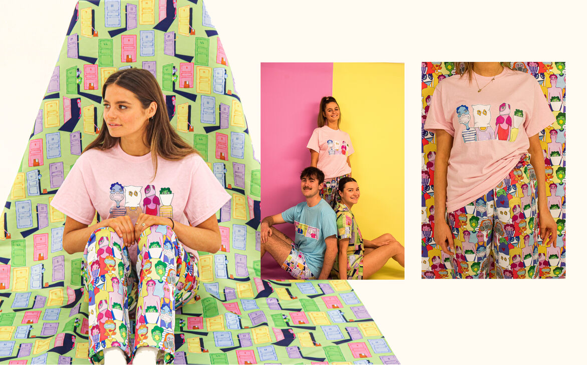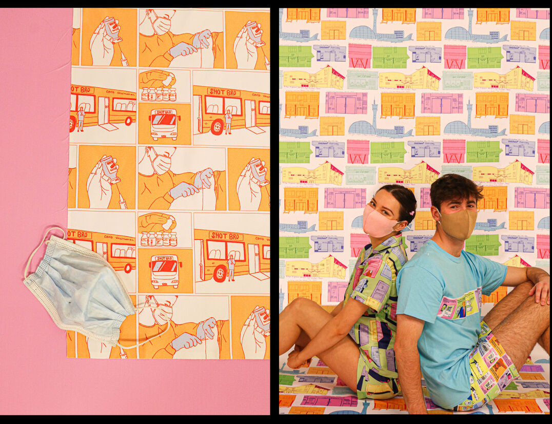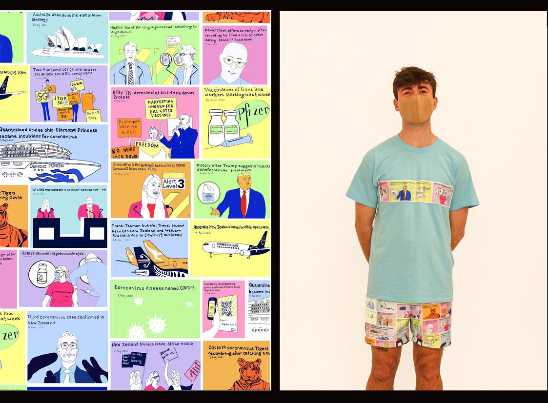 The hero print of the collection is inspired by photos that circulated on social media of some of the crazy masks that had been spotted out and about. Colourful characters don WWII gas masks, paper bags, and underwear to fight off the virus. Another shows people peering out cracked doors, cautious of the virus lurking outside. Other coordinates show locations of interest, the vaccine rollout, and an overwhelming look at some of the news headlines from 2020 and 2021. The resulting collection is a colourful, tongue-in-cheek look at how New Zealand experienced the Coronavirus Pandemic.