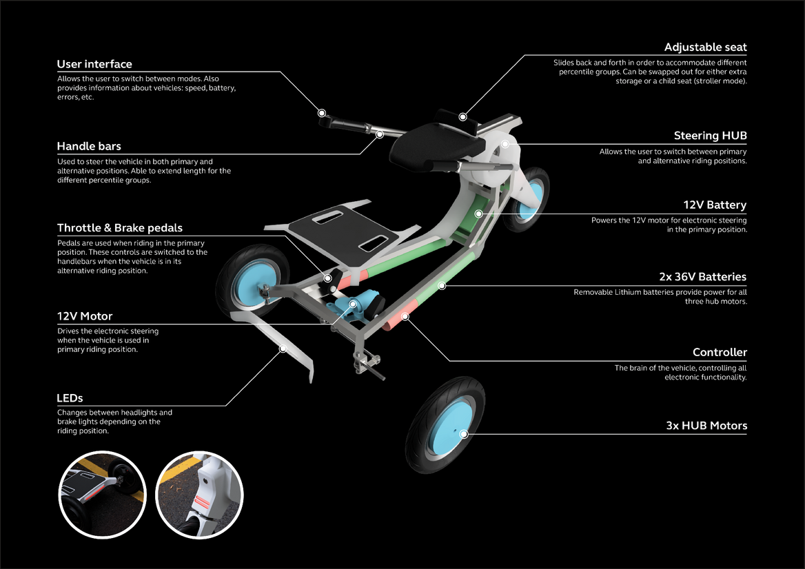 In the primary riding position, the user is seated with the electric hub motors on either side of their feet. Handlebars are on their left and right, electric steering is activated with a subtle push and pull motion. The user interface control is located at the end of the handlebars, with pedals for accelerator and brake. A removable storage unit is situated below and behind the riders legs. A feature of this riding position is an Active Mode which allows the user to convert the accelerator and brake pedals into kinetic assist pedals, a means of physical propulsion with user adjustable resistance settings that provides a boost to the overall ride – a reversal of the power assisted bicycle.
