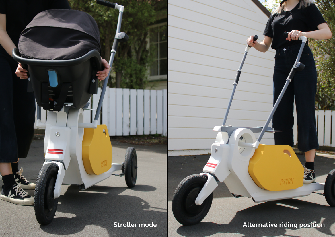 In the alternative riding position, the user stands upright between the two hub motors, facing the single wheel, and now moves forward in the opposite direction. With the handlebars tilted up and in front of the user, mechanical steering of the single wheel is active and electronic steering of the other two wheels is locked. The seat can be removed storage is made available when the seat is removed and replaced with an storage module to extend capacity. A feature of this riding position is Stroller Mode, that allows users to swap out the seat or storage module for a baby capsule. Stroller mode converts Psych into a speed restricted ride-on stroller, enabling parents and caregivers to extend their independent commuting range and capabilities.