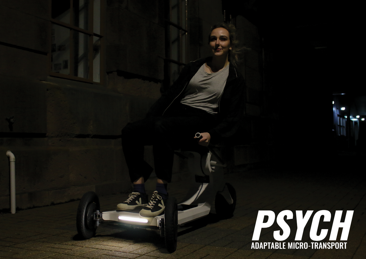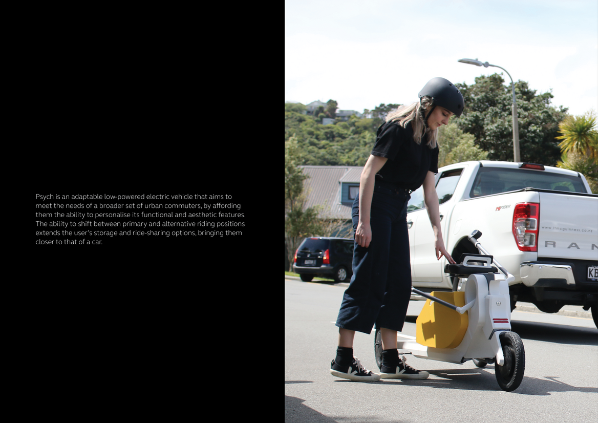 Psych is a highly adaptable, low-powered electric vehicle that meets the needs of a broad set of urban commuters through its ability to alter and personalise its functional, aesthetic and sustainable features, encouraging a shift away from cars within the urban landscape.