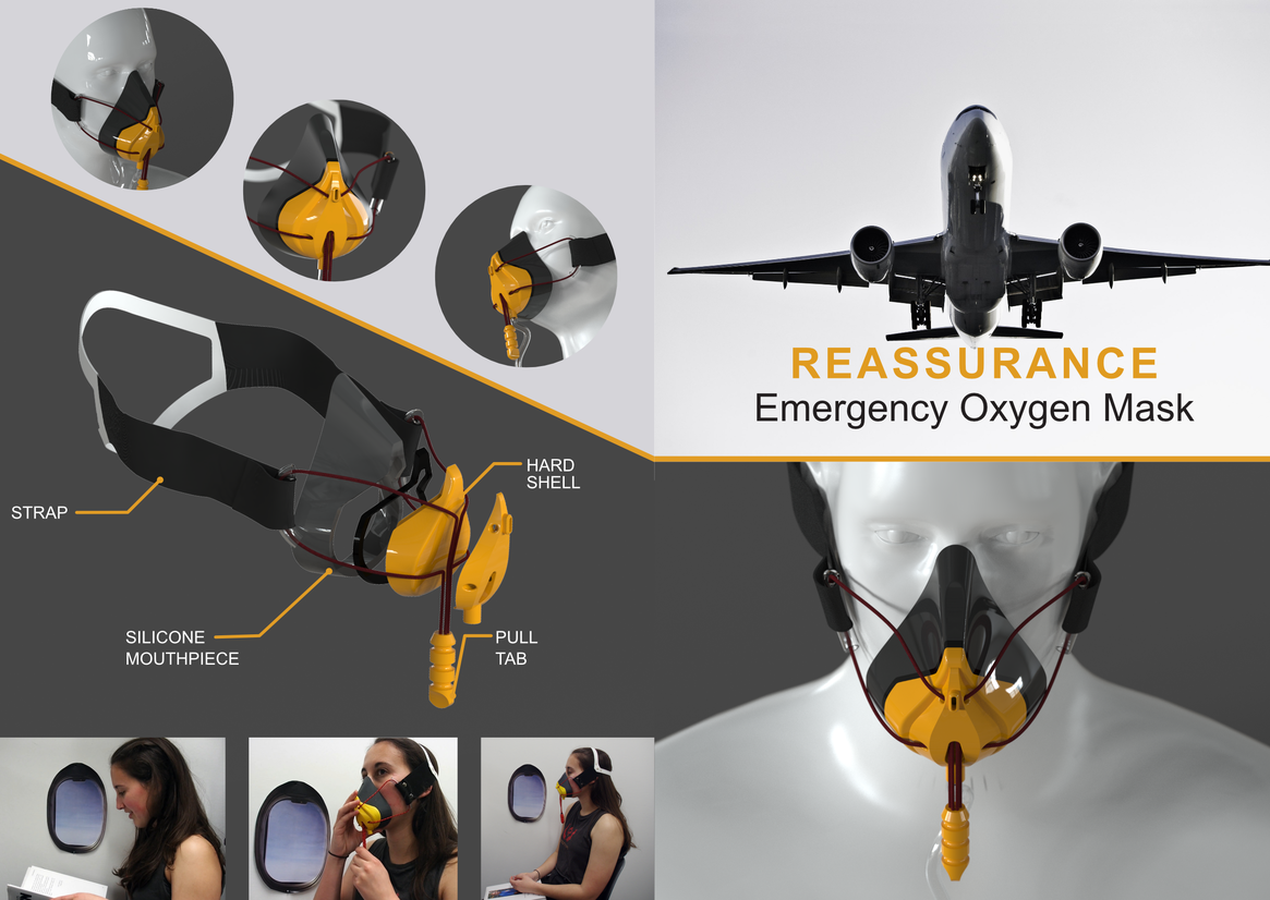 Reassurance reimagines passenger airliner emergency oxygen masks, addressing the significant potential for users to wear existing masks incorrectly. Through improved affordances, product semantics and improved strap design, Reassurance provides a more intuitive solution and ensures passengers feel a level of reassurance in a high-stress situation.