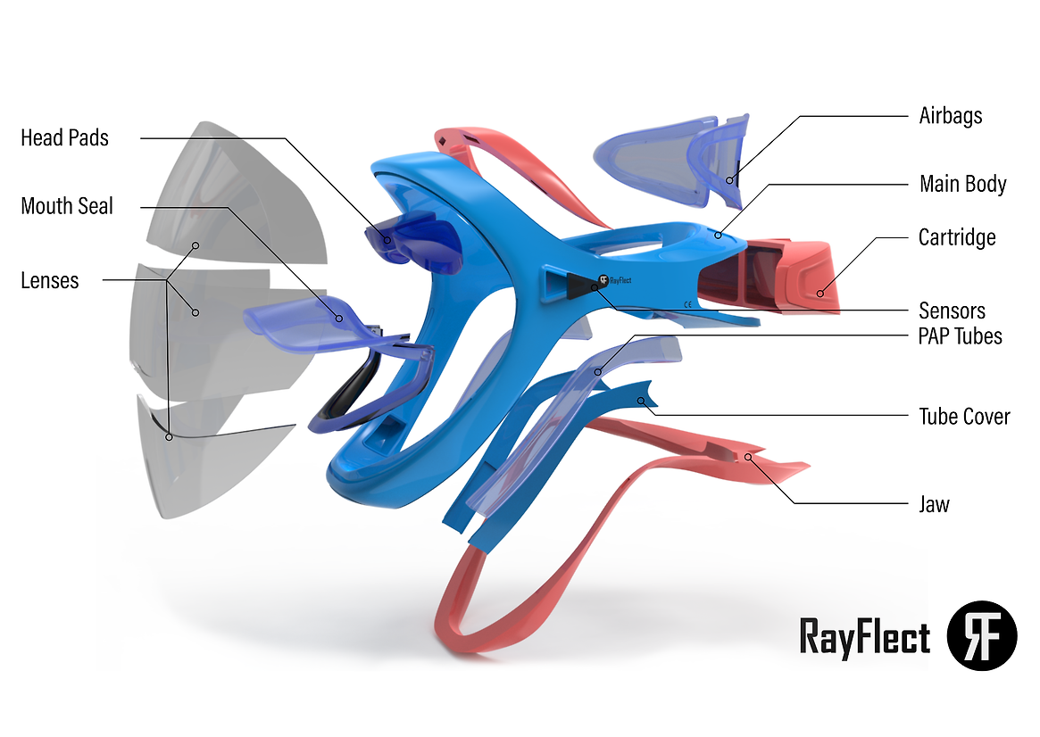 The Rayflect Face Shield is designed to improve the safety and experience of physicians operating medical equipment that emits ionising radiation. Thorough investigation into medical radiation exposure revealed the heightened risks faced by these physicians, particularly in terms of brain cancer, thyroid cancer, and cataracts which can arise over a physicians’ career. Existing shielding equipment often falls short in adequately protecting the face and head. The face shield addresses the specific workflow and environment of physicians, ensuring optimal functionality and protection. Specific materials are incorporated into the outer components to successfully attenuate radiation. These materials increase the density of the shield, preventing harmful rays from passing through and causing long-term harm to physicians. This is particularly crucial for interventional physicians who rely on fluoroscopy machines, as scatter radiation, an unwanted biproduct of x-rays bouncing off atoms, poses a significant risk during procedures. To combat complacency towards radiation, subtle lighting is integrated within the face shield. This acts as a visual indicator, alerting the wearer when the shield is exposed to radiation. By raising awareness and guiding the positioning of other protective equipment, a safer environment is fostered, and good habits are encouraged. Additionally, dosimeters are seamlessly integrated into the shield, providing real-time radiation exposure records that can be invaluable throughout a physician's career. Communication challenges faced by physicians during procedures are addressed through the large, clear screen that allows for easy lip reading without the need for surgical masks. Furthermore, a microphone and speaker system enable seamless communication with staff in other rooms. To maintain a clear view, a positive air pressure system is incorporated into the face shield preventing fogging of the screen. In addition to the functional aspects, patient comfort and satisfaction have been considered. The shield's pastel colours, carefully chosen in orange and blue, promote positive emotions. Orange symbolises courage, instilling confidence in patients, while blue fosters trust between the patient and physician. Furthermore, the full glass screen allows patients to see the physician's face, establishing a more personal connection and reducing the perception of wearing an impersonal "helmet." Convenience and hygiene were also considered in the design. Proximity sensors enable physicians to easily raise or lower the visor without the risk of cross-contamination. A simple wave of the hand past the sensor ensures a hygienic and efficient adjustment process, maintaining a sterile environment.