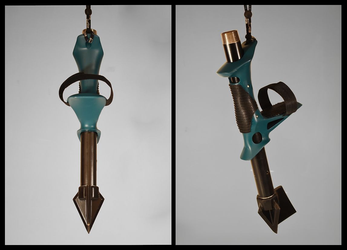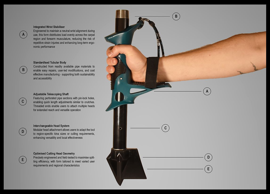 Reefguard is composed of a lightweight but durable modular shaft, made from standardised pipe to allow for local sourcing, easy repair, and user-led modification. Telescoping perforated sections allow the user to adjust length depending on reach or diving environment. Threaded ends accept interchangeable heads - accommodating various kina sizes and dive conditions. A custom-engineered head geometry improves kina split efficiency and leaves a visible trace on the reef, helping divers mark cleared zones. The integrated wrist stabiliser keeps the wrist in a neutral position, distributing load evenly through the arm and reducing the risk of repetitive strain injuries. The form and function were refined through repeated testing, with durability, ergonomics, and modularity guiding every iteration.