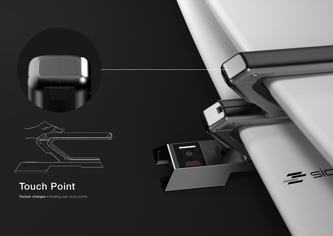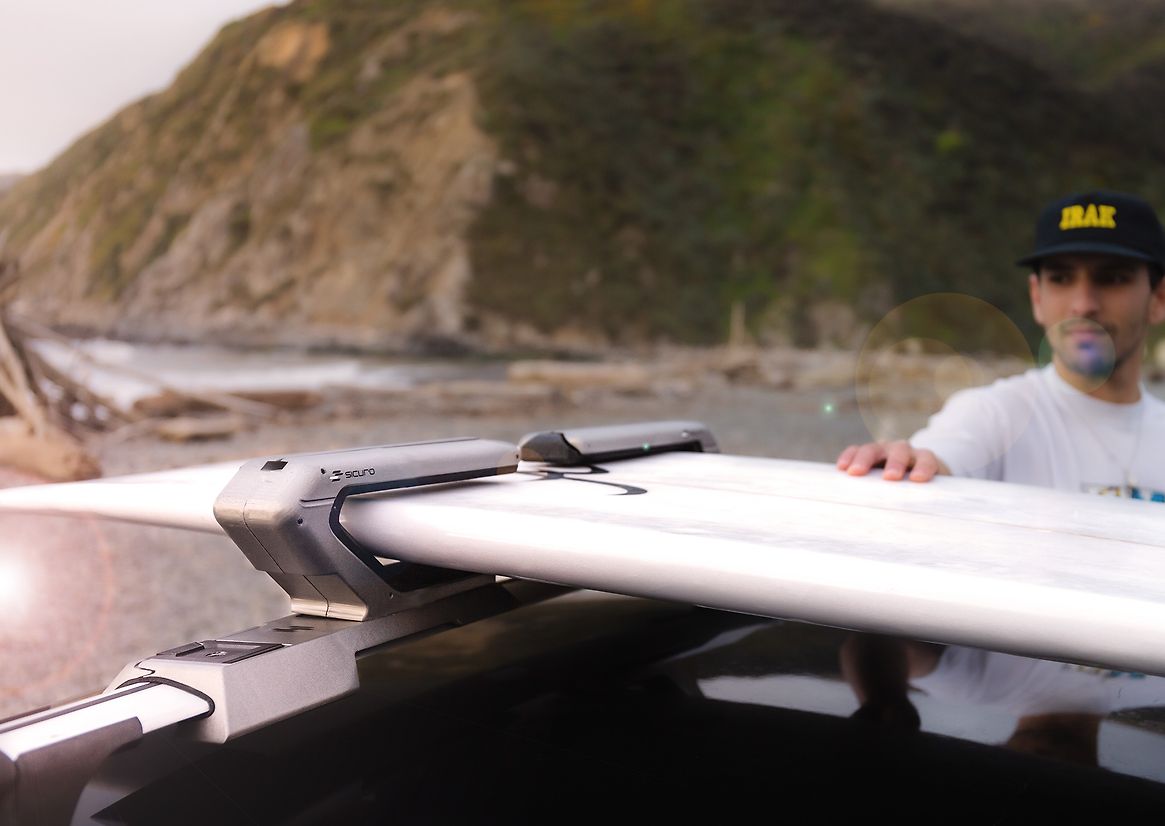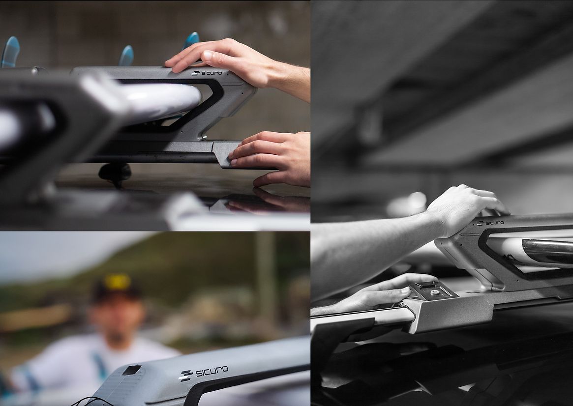 Sicuro’s clamp system features a rubber Santoprene inner housed in a diecast aluminium body, providing optimal board protection against pressure dings and theft. The use of lateral tension to securely and safely hold two surfboards on top of any vehicle, provides a reliable and hassle-free transport method.This lateral tension, coupled with a surfboard's fundamental rail shape (taper), effectively secures the boards in four places. Sicuro’s ergonomic design incorporates intuitive touchpoints and directional cues, ensuring a seamless user experience.