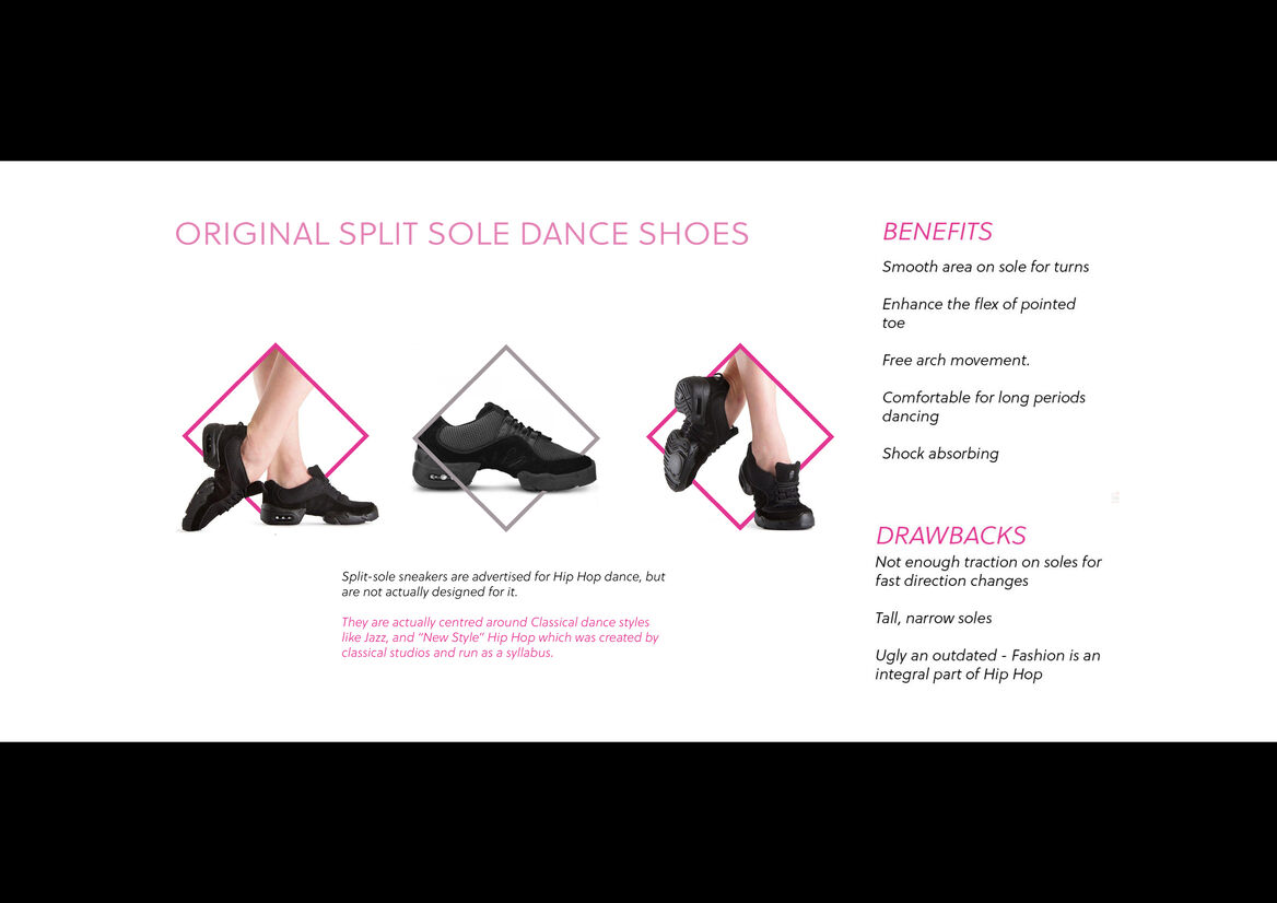 Split sole dance sneakers are advertised for Hip Hop dance, but they are not specifically designed for it, they were introduced by classical dance’s syllabus style in response to Hip-Hop’s popularity. However, a two-part sole does provide benefits that are an asset to a Hip Hop dancer – increased arch flexibility and better foot control, so Soul Flex is a redesign of the split-sole dance sneaker targeted to Hip Hop dancers.