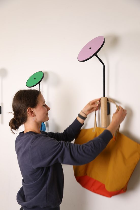 Sprout's botanic aesthetic is a fun addition to entranceway coat and apparel management. The circular flower element comes in a range of sizes and colours, encouraging playful composition for any context. Simply adjusted by lifting the mounting stalk, rotating and dropping into a secured position, ready to receive coats, hats, umbrellas, walking sticks, and other miscellaneous items.