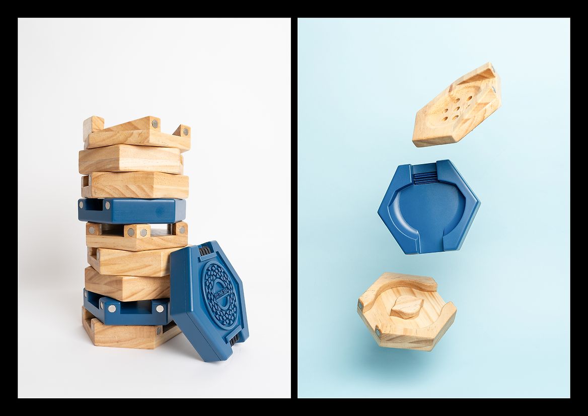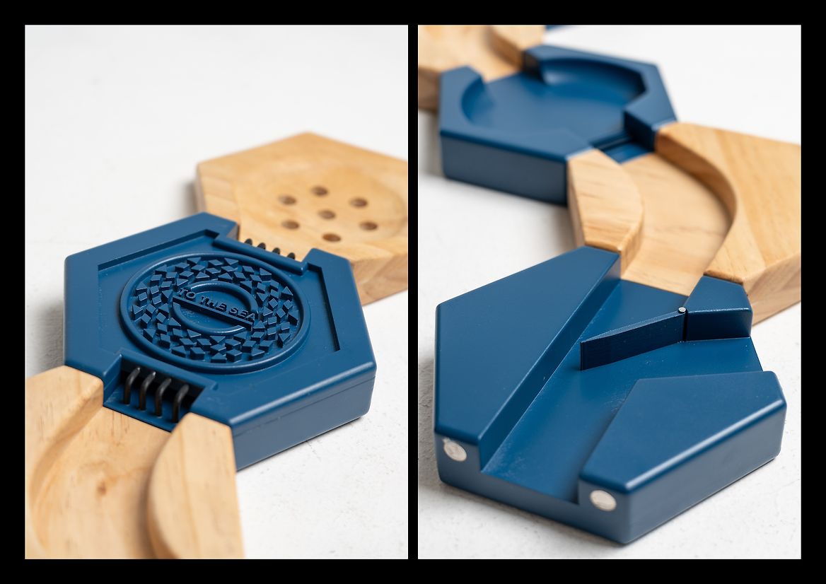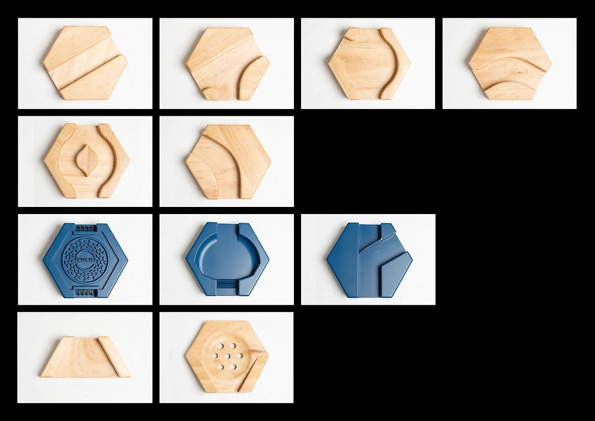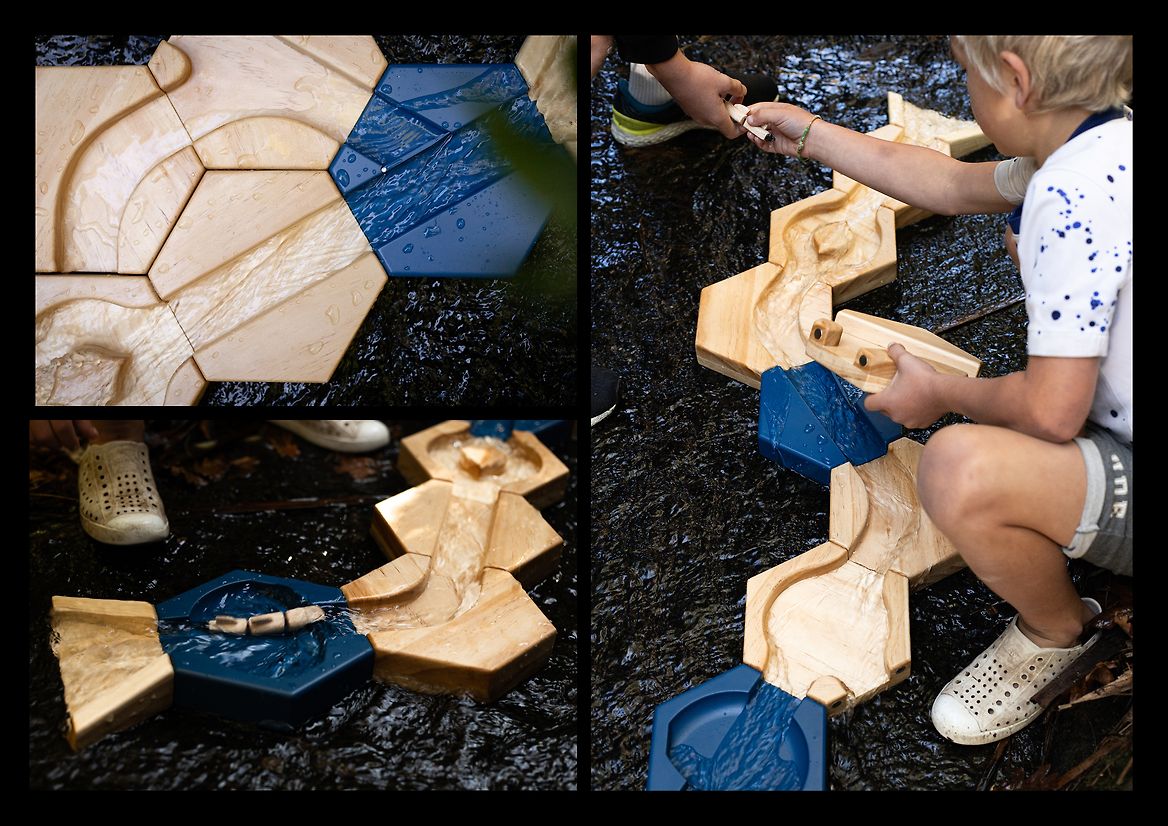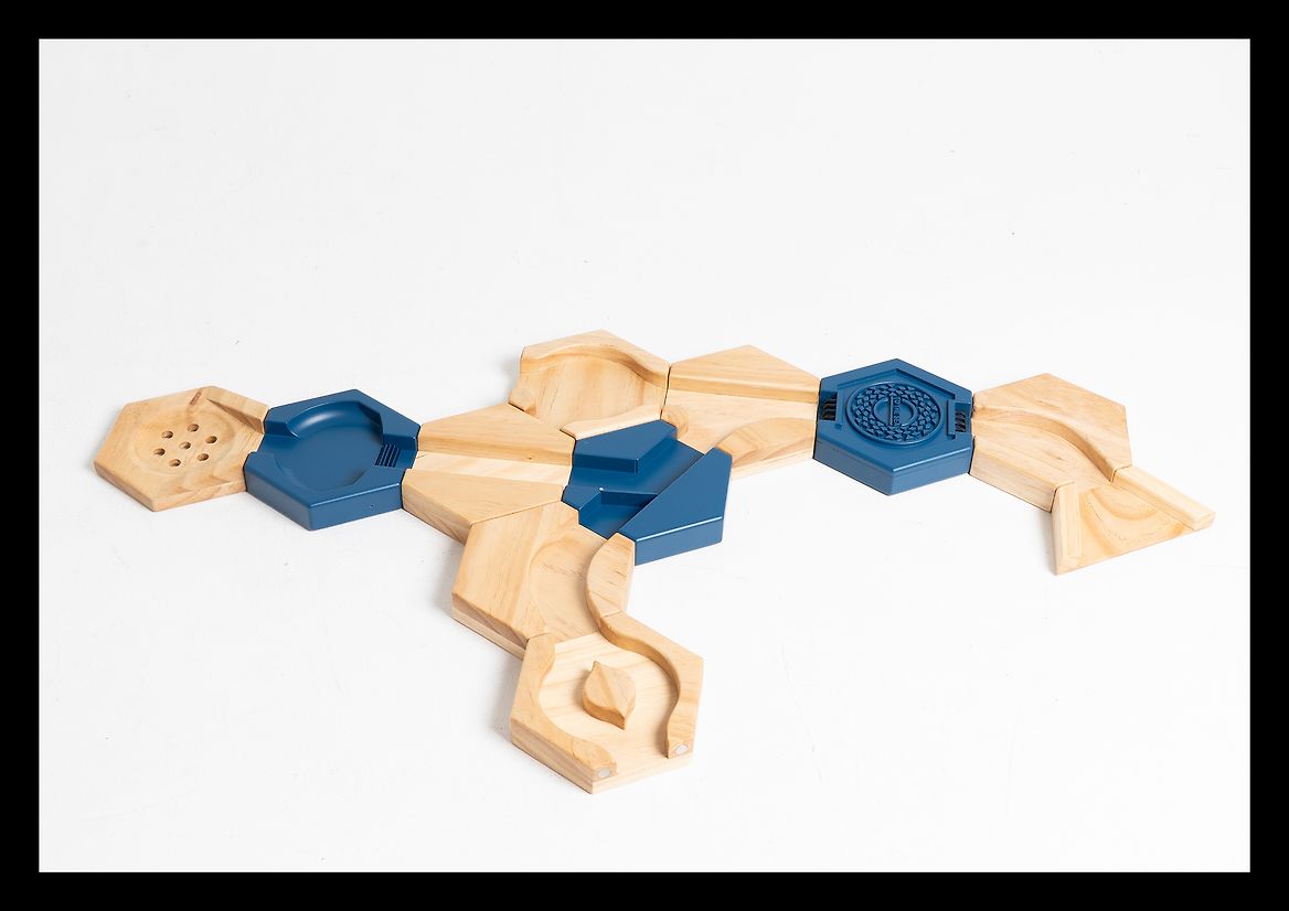 The Tiles have six sides, and every face with a river exit and entry has magnets allowing it to attach to other pieces adjacent. Some paths may not be feasible due to urban man-made tiles acting as a barrier or simply becoming a difficult obstacle to navigate. While the more natural pieces allow for an easy flow of water, enabling Tuna to flow seamlessly through. Children can create their own narratives to drive their intentions for changing the river paths, and the consequences of their actions, such as making the windiest path possible or creating the fastest and strongest flow of water. Natural materials, such as rocks, mud, and sticks, can also be added to the tiles to adjust the water flow.