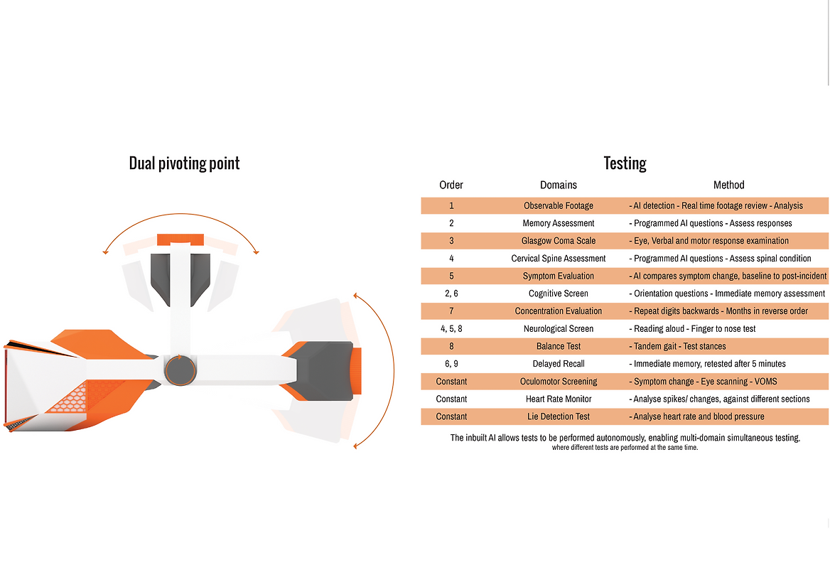 Utilizing artificial intelligence and virtual reality to simulate augmented reality. The final design is a headset based solution that autonomously performs the concussion test. The innovative use of AI and VR helps to resolve the current issues identified with existing testing tools. This includes testing times, cost, standardization, pretesting and requiring the presence of a medical professional to perform tests.