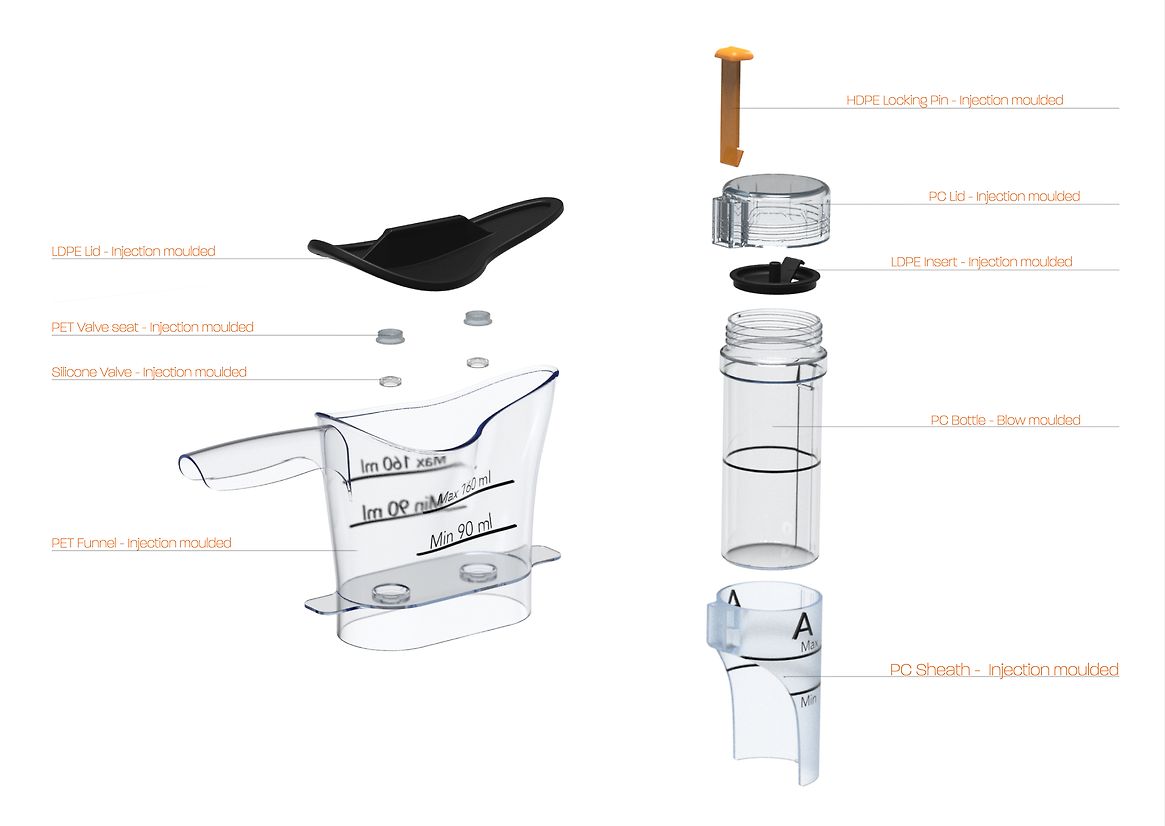 Material selection and sustainability considerations were challenging due to the harsh environment bottles are kept in (sometimes frozen as cold as - 80°C), because of this, the functional components of the bottles are made out of polycarbonate. PET was chosen for the collection vessel as it is essential that it does not leach any chemicals into the urine sample. Unfortunately due to the large number of tests completed and the nature of the testing, equipment is likely to be disposed of after use, because of this a major sustainability consideration was to include as few components and materials as possible to reduce the carbon footprint of the product;