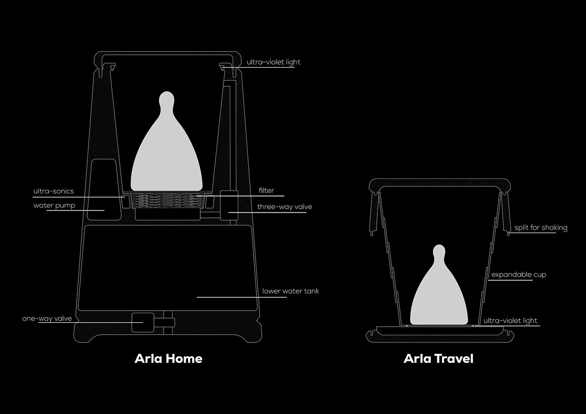 Arla Home uses ultra-sonics to clean the menstrual cup, with a water filtration system to cycle the water and ultra-violet light to sterilise the cup after the water is drained into the lower tank. The cleaning process is 20-30 minutes; longer than current practices but does not need constant monitoring. Arla Home sits on Arla Base while cleaning but has a small battery capacity to release water after cleaning.