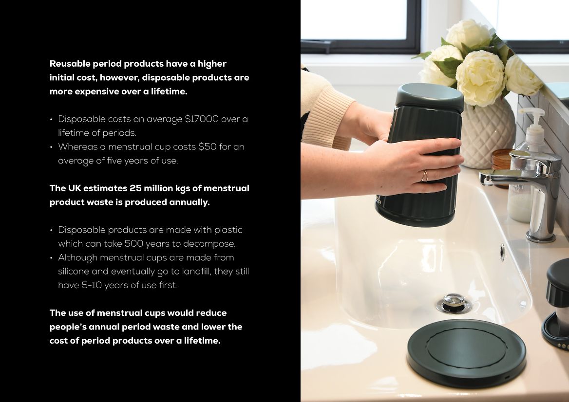 Current cleaning methods for menstrual cups are either boiling on a stovetop or sterilising with tablets. Both these methods are not discrete, have high water consumption, and need monitoring to ensure the cup is sterilised.