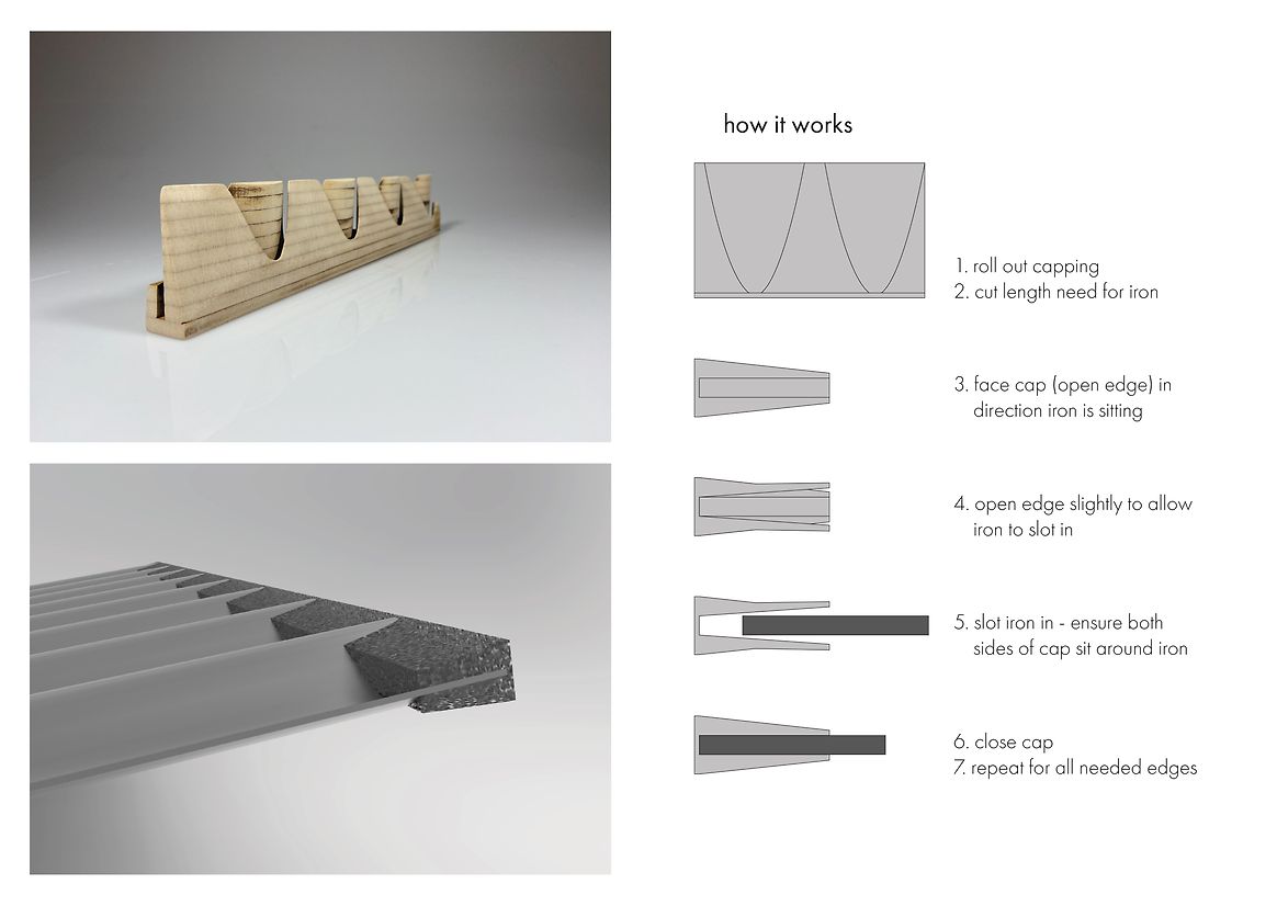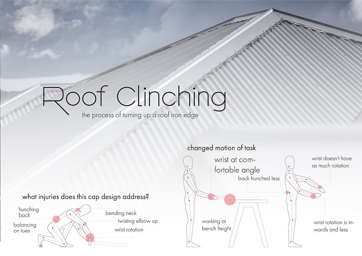 This design eliminates manual clinching which causes many injuries in the roofing industry. This includes the wrist and back as the task is often performed on the ground causing the body to twist or hunch over. Corrugate Cap can be applied on a bench or on the truck, so is at optimal height and involves fewer moves of the iron sheets. The flexibility of the cap also changes the wrist action, so does not cause pinching in the wrist which is expected to reduce the number of injuries caused by roof clinching. Time is the other factor as this design reduces the time taken to complete this task as the cap simply pushes on the iron.