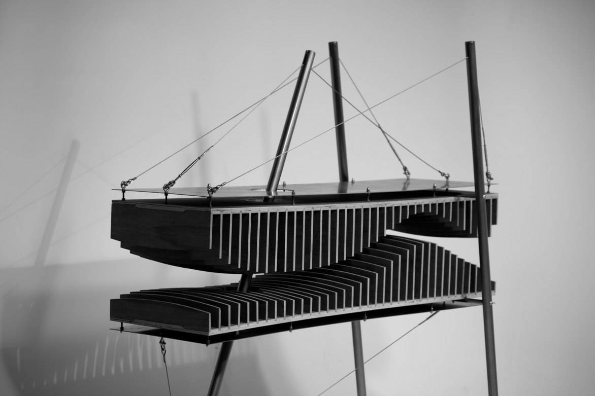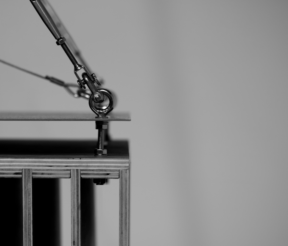 Studies on Dutch painter Constant Nieuwenhuys rendition of New Babylon were conducted, analysing how a singular mast, or multiple masts, interact with secondary supports to create asymmetry. These speculative paintings provided the foundations for interpretation. A constant dialogue between architecture and furniture, with joint details being the chosen medium of exploration.