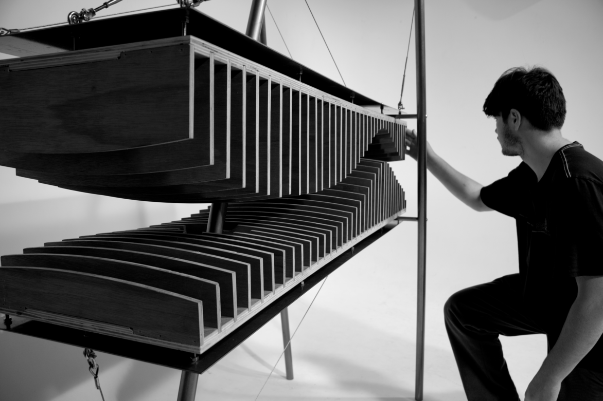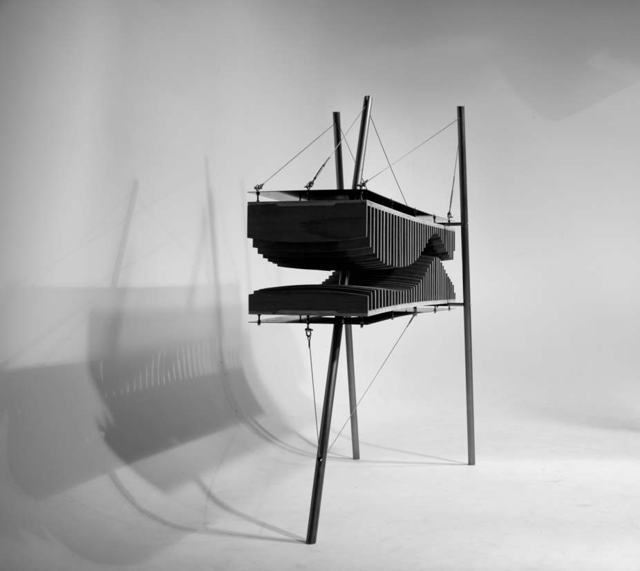 This vinyl holder investigates how architecture can be represented as furniture through scalar exploration. It is an experimentation process driven by maritime and parametric aesthetics, producing a unique design that fuses the realms of architecture and furnishing. Details were derived, in combination, from ‘the machine’, precedent tension systems and speculative architecture.