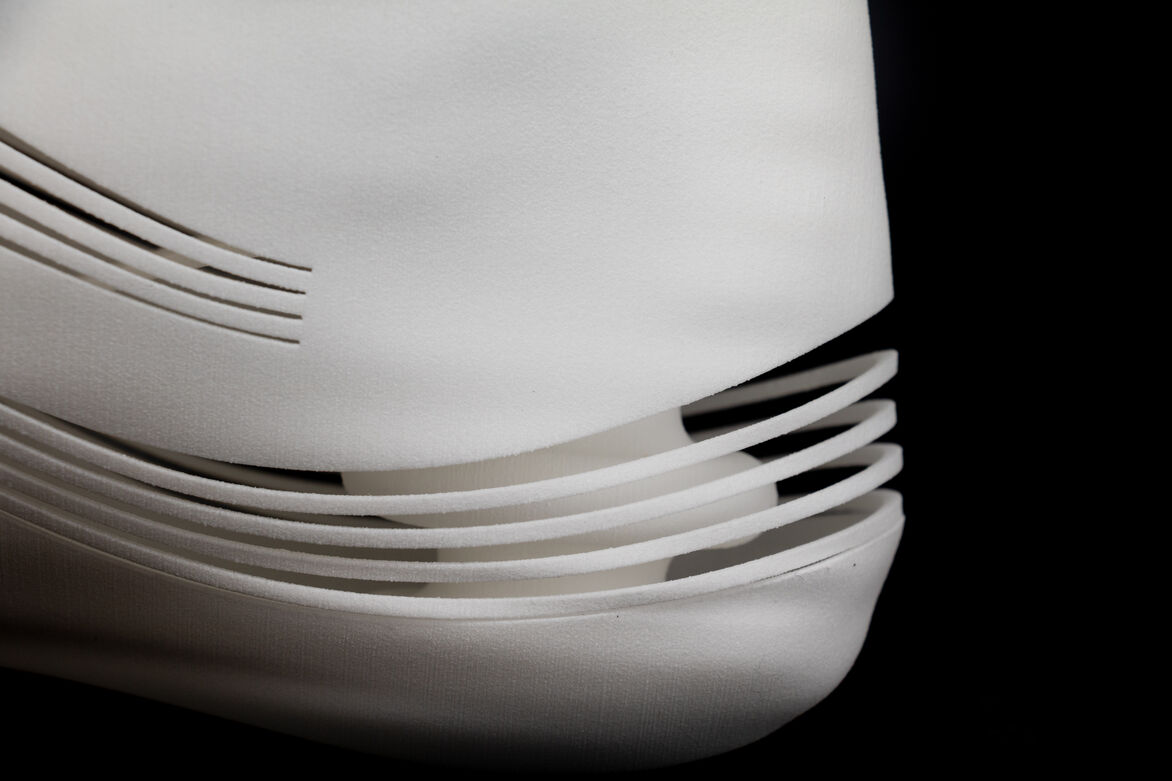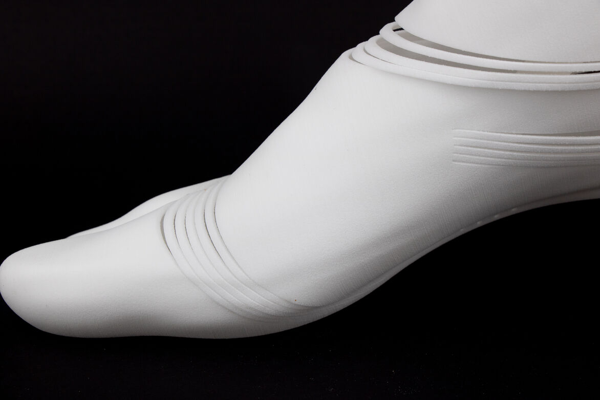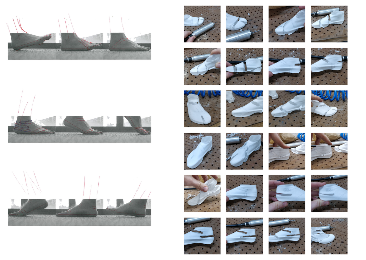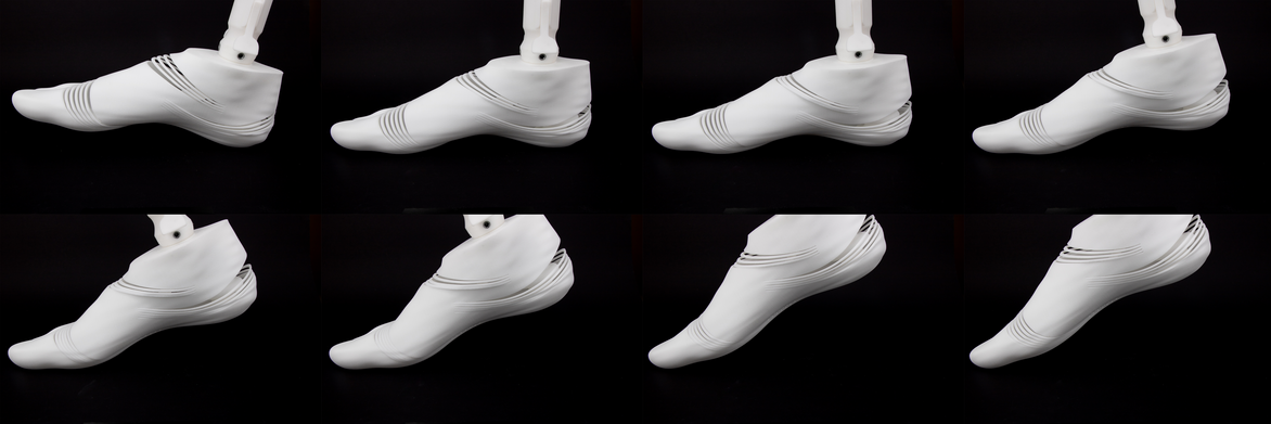 The Dynamic foot design is an additional foot to a patients typical walking foot that could be worn at the beach. Analysing video footage of the human gait cycle, informed were to create flexible sections in the foot prosthetic. The slot cut designs have an attractive, dynamic quality to them. The cut sections close as the foot engages through pressure and open as pressure is relieved when propelling the foot forward. As it opens, the windows show the interesting dynamic of these components in action. The internal features include a sheet of 2mm nylon that acts the same as a carbon fibre prosthetic foot design, using a curved profile acting as a spring and a bellow spring design to provide extra support and stability.