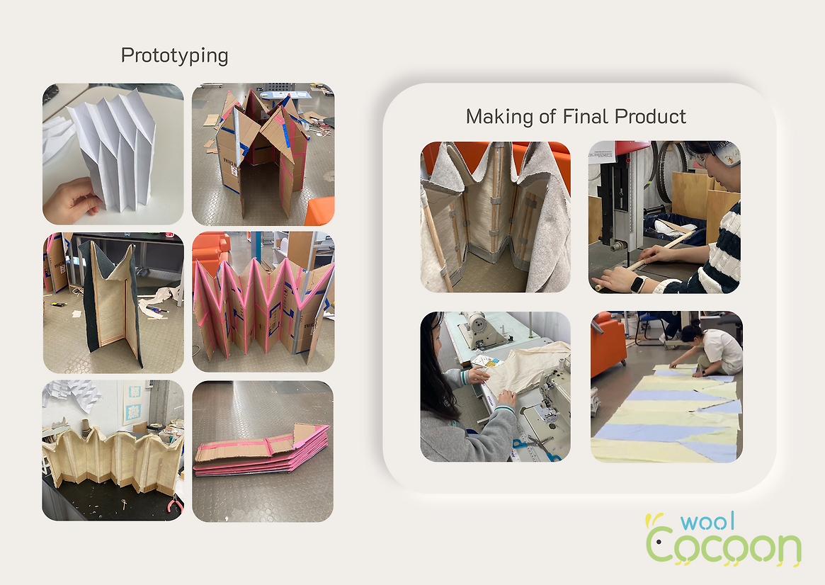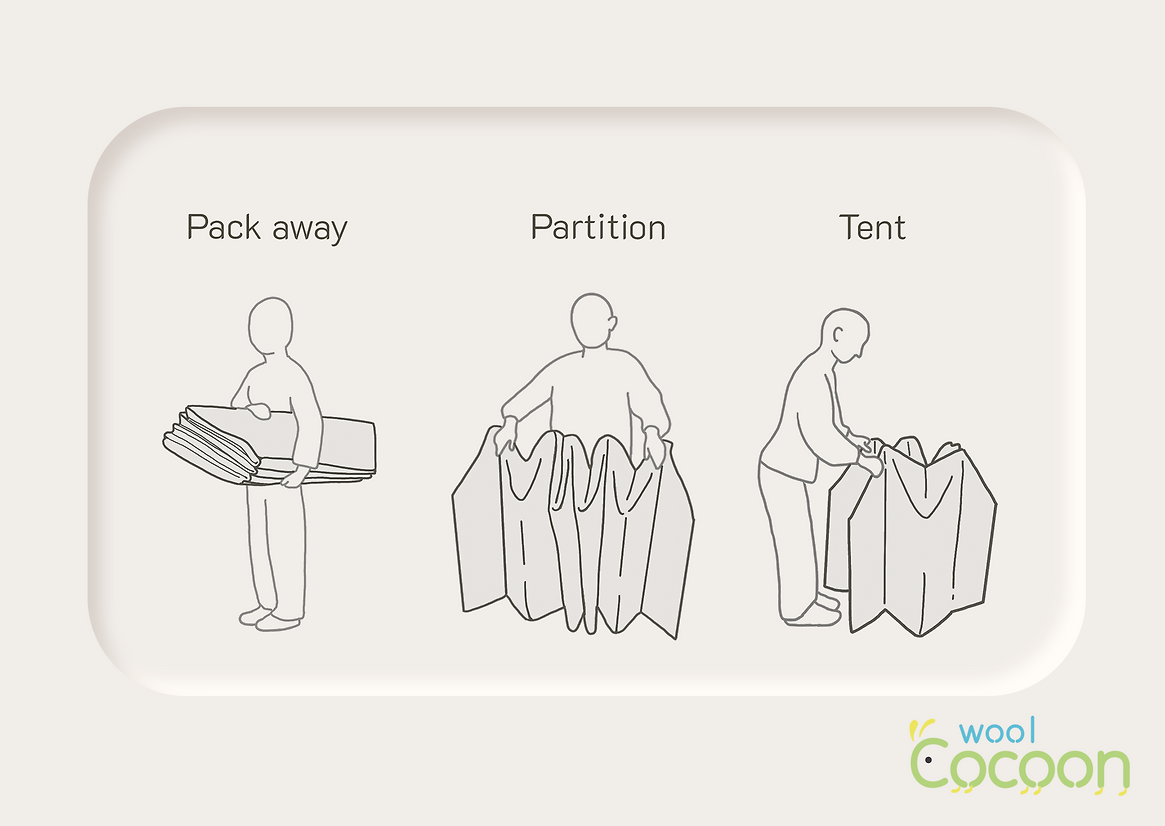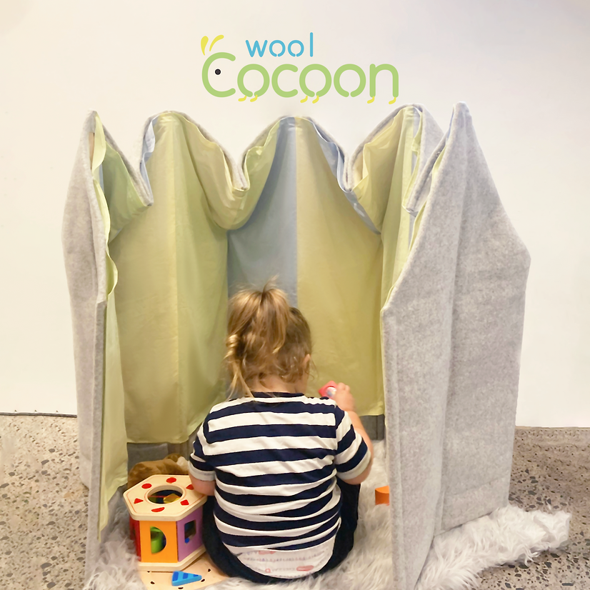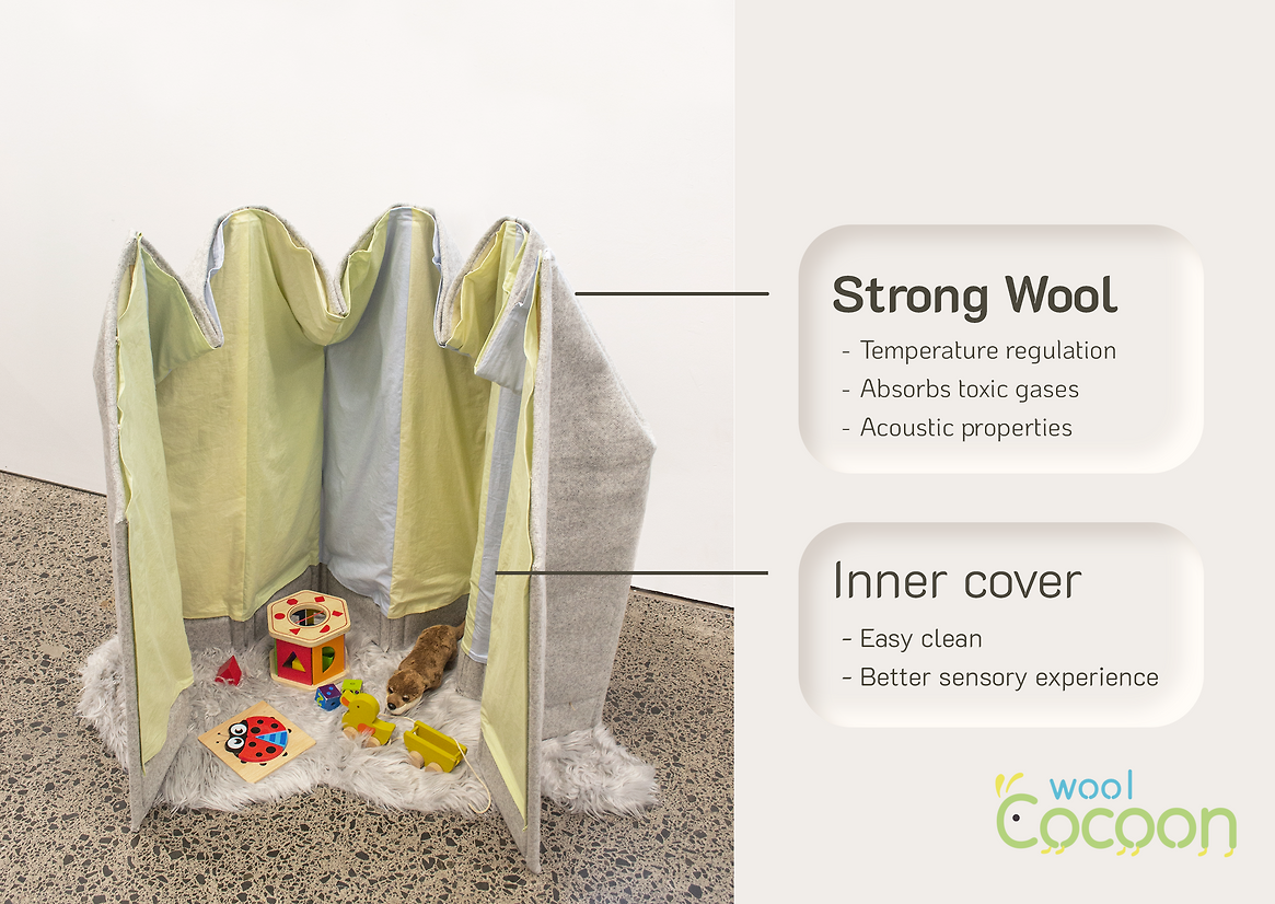 Cocoon is made solely from organic materials and is free from synthetic adhesives or dyes. The primary material, strong wool, is used in the outer cover. Strong wool is capable of absorbing up to 55% of noise. Additionally, wool fibres regulate temperature and capture toxic gasses like NO2 and SO2 commonly found in homes from sources such as gas stoves, paint, and cleaning products. Wooden structures are strategically integrated into the felted strong wool, ensuring optimum strength and stability without the need for toxic adhesives. Furthermore, integrating strong wool boosts a significant local industry and embeds the NZ cultural identity. The inner cotton cover is eco-dyed; ensuring safety for children and the environment. It is easily washable and caters to individuals sensitive to coarse fibres, common among those with ASD and ADHD.