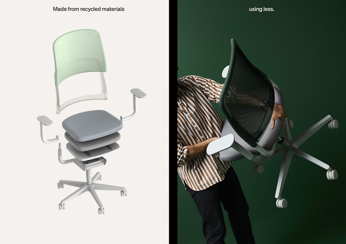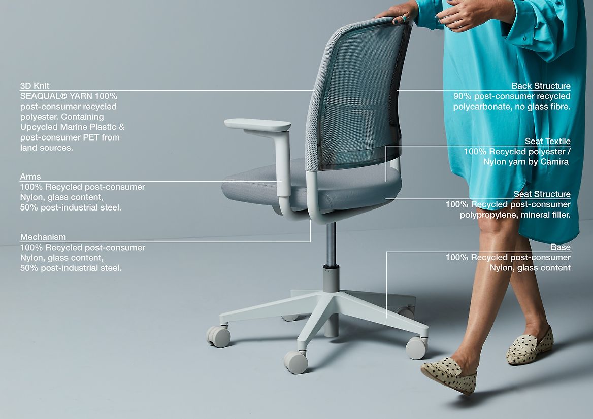 A product designed to surpass changes in trends, and to outlive others in the market. With sustainability at the core of the design approach, a high proportion of recycled material (both post-consumer and post-industrial) is used, and when it does reach the end of its life each part can be separated, replaced, repaired, or recycled. Sound ergonomics result in an incredibly comfortable chair that moves with the user.