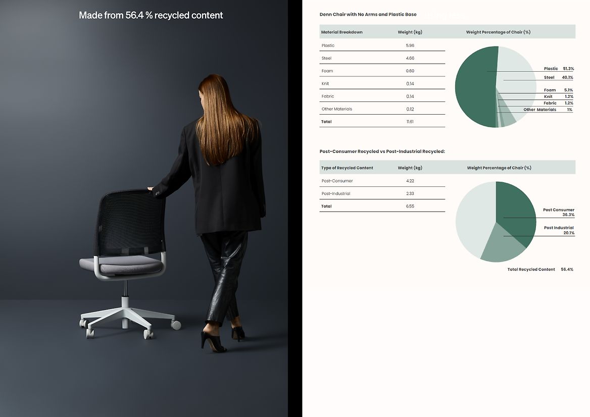 Every one of Denns components have been designed with the environment in mind. The transparent back structure is made from 90% post-consumer recycled polycarbonate and uses no glass fibre enabling better recyclability. The back surface is made using SEAQUAL® YARN, a 100% post-consumer recycled polyester fabric which contains upcycled marine plastic litter and utilises 3D knitting which significantly reduces manufacturing waste. The main structural plastic elements are made from 100% post-consumer recycled nylon.