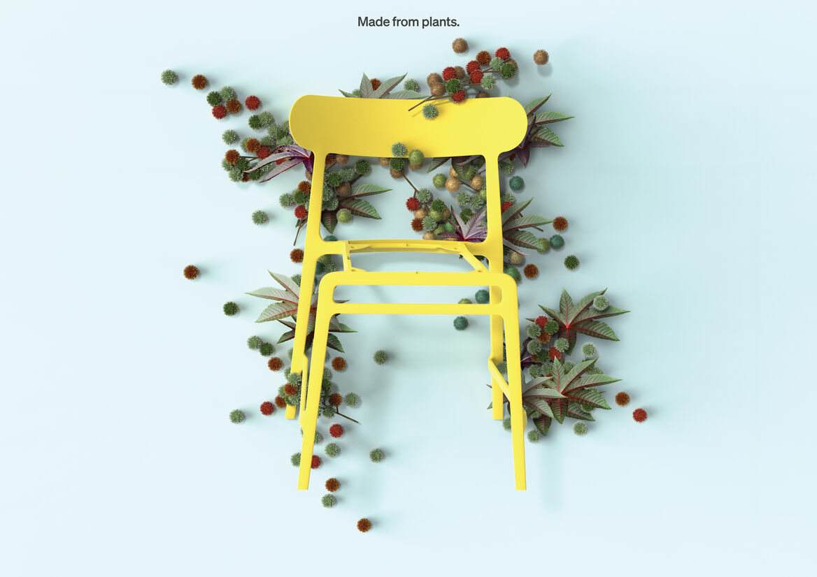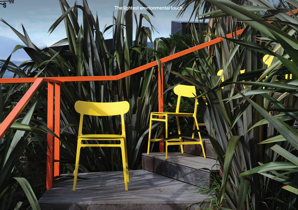 Lightly is the first chair to be made with the plant-based polymer EcoPAXX. The EcoPAXX used in the chair frame is derived from the highly CO2 absorbent castor bean plant. It has an independently verified carbon footprint of just 1.9 (kg CO2 eq./kg) as opposed to a carbon footprint of 6.5 for an equivalent fossil based polymer. Lightlys seat pan is made from recycled post-consumer ASA which is a tough and highly UV resistant material.
