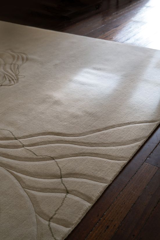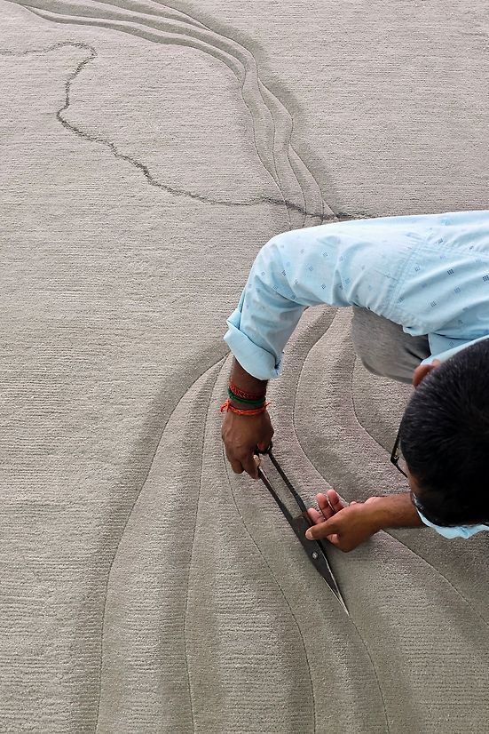 The finalised Wisp design was hand knotted by artisan weavers in Nepal, using New Zealand wool at a density of one hundred knots per square inch. This hand knotting technique provides a depth and texture that machine-made carpets cannot achieve. After weaving, shears were used to recreate our vision, with hand crafted three-dimensional carving.