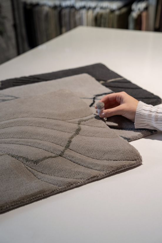 The Wisp’s sweeping organic movement is much like single brushstroke artworks or ‘action paintings,’ where the act of intuitively drawing medium across a plane records the artists gestures, becoming the final product. Our intention is that the tonal curves of the Wisp design can be altered to each client’s floor plan, curating an ergonomic pathway through their room. This project involved several sample developments, communication with our factory, deliberating over warm colour palettes that would suit a range of interiors, and experimenting with carving until we achieved the depth and softness we were aiming for.