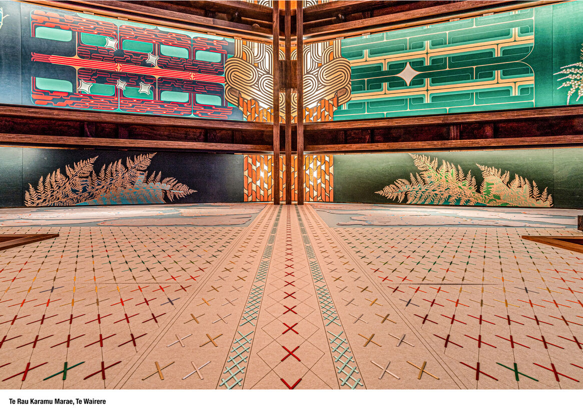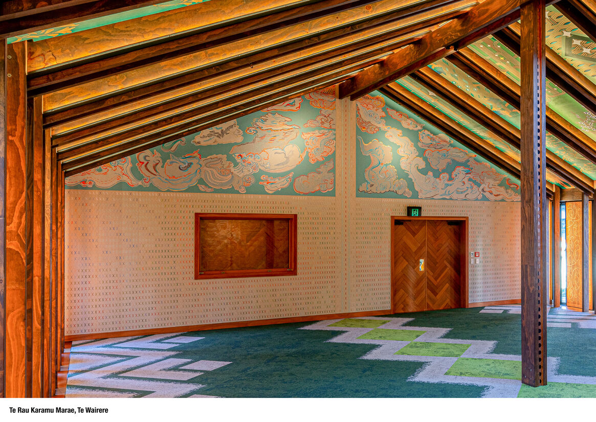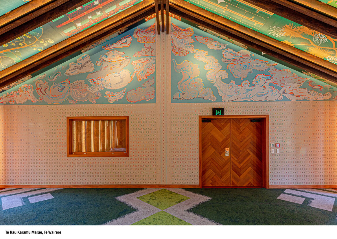 The different aspects of the interior wharenui toi-whakairo (artwork) speak to the forest’s relationships to all things found there; birds, insects, light as fire, sun, moon, stars, the cosmos, genealogically linked to wāhine/tāne atua, bring us back to our sense of belonging here in Te Ao Mārama - the world of light.