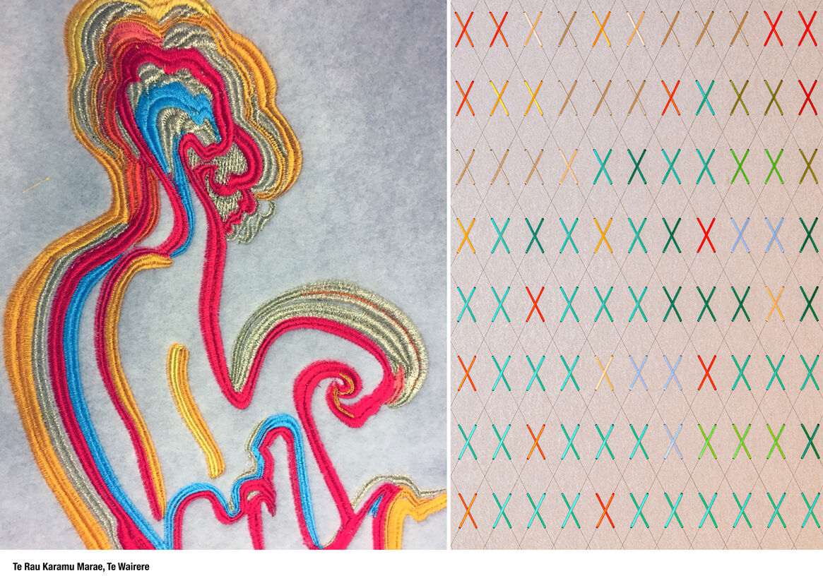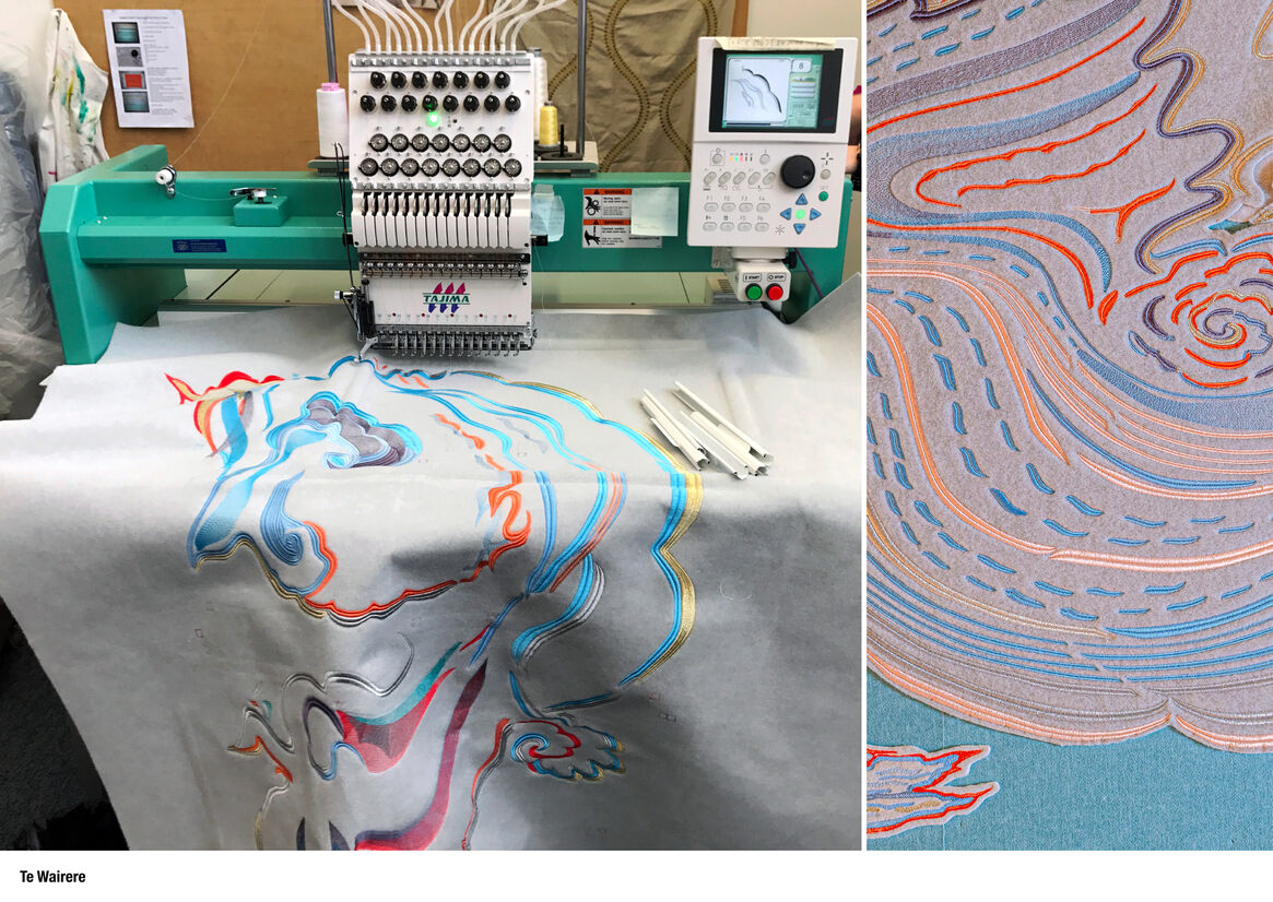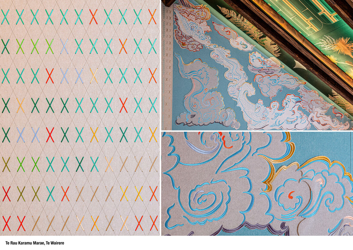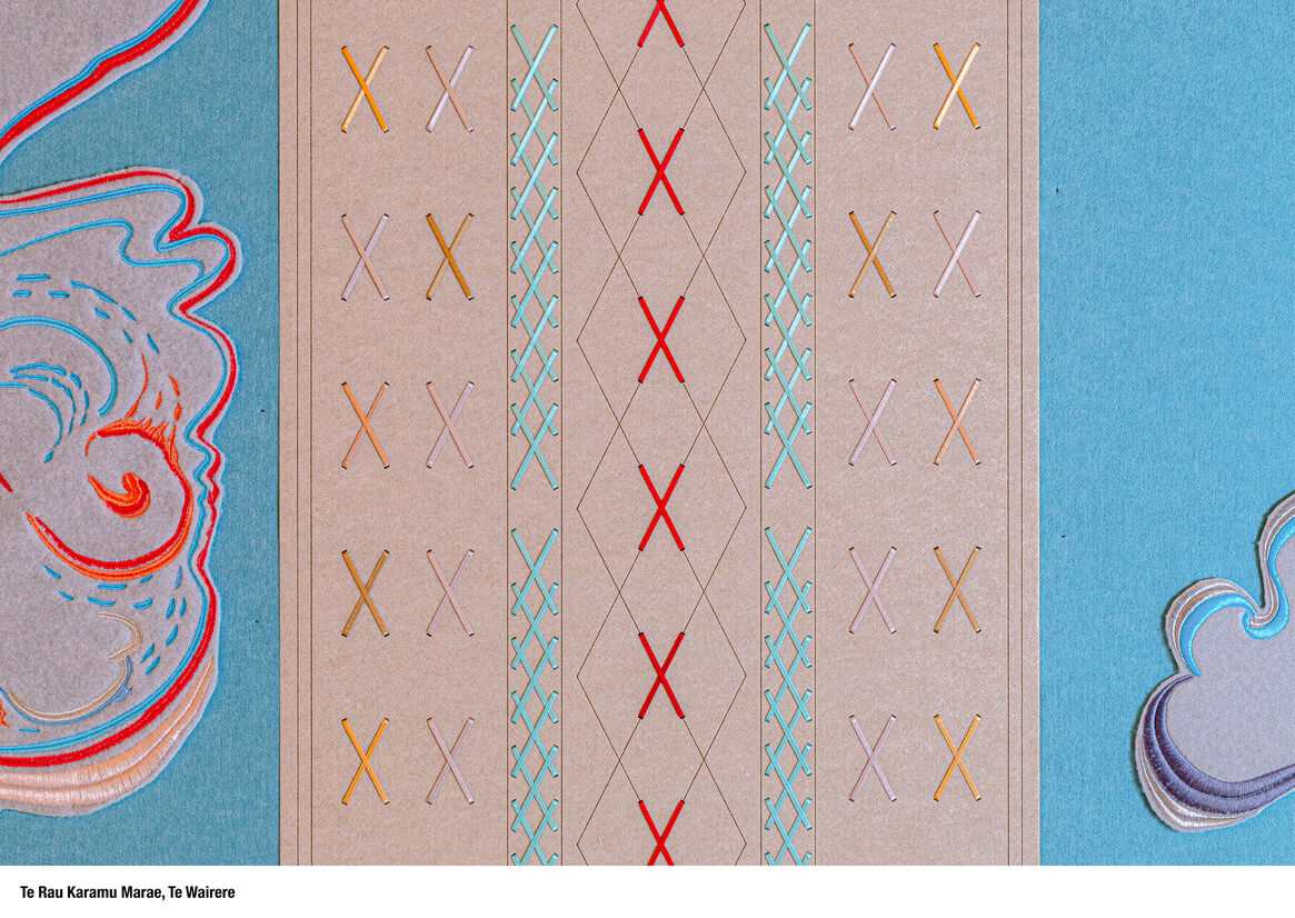 The top half of the wall features digitally embroidered Vertiface, in a skyscape featuring numerous cloud, rain, air current entities. The forms, textiles, and colour refer to aspects of the transformative prophetic arts revealed from the 1860’s, such as hand-stitched flags through to the embroidery by wāhine in the early mission stations.