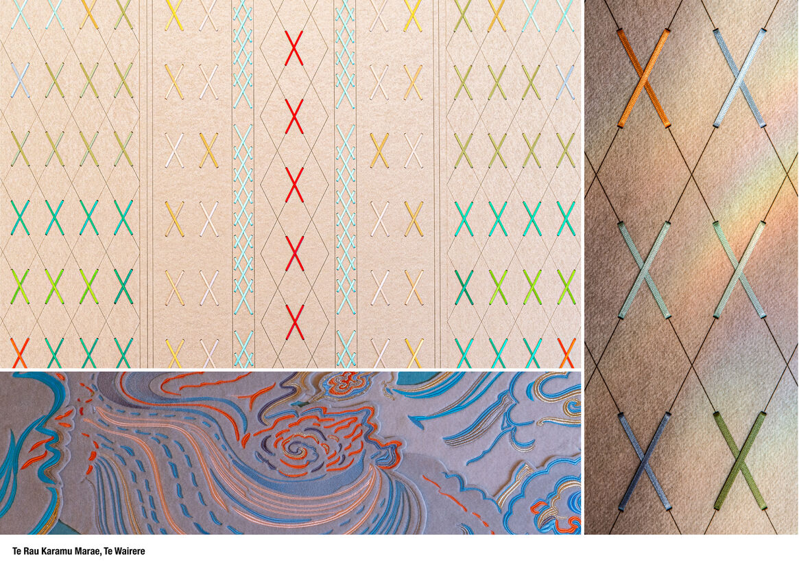 The Autex also functions as an artistic medium. The tukutuku of the lower half of the wall features 32 panels cut from Cube, finely machined slots and surface-etched. The ribbon-lashed patterns were completed through three community wānanga, to create a pixelated kea visualised as landing or taking flight. The pou defines the central vertical zone, spanning floor to apex, providing symmetry and continuity to the entire wall, with a design expressing the flows of energies-waters. The tukutuku is crisp, clean-cut and warm.