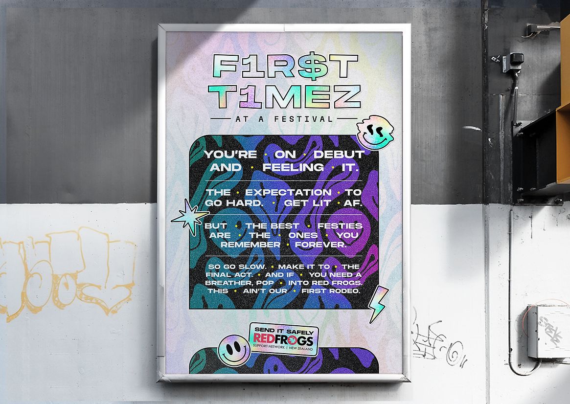 With the 2024 festival season being their biggest roster of events yet, the brief was to support Red Frogs by promoting safer partying behaviours before patrons stepped through the gates. But this audience is notoriously tricky to reach. How could we talk to them in a way that would cut through the noise, and didn’t feel like a complete down-buzz?