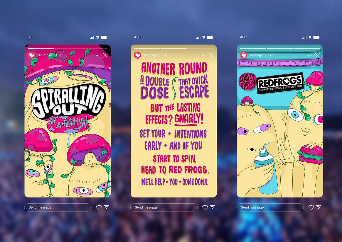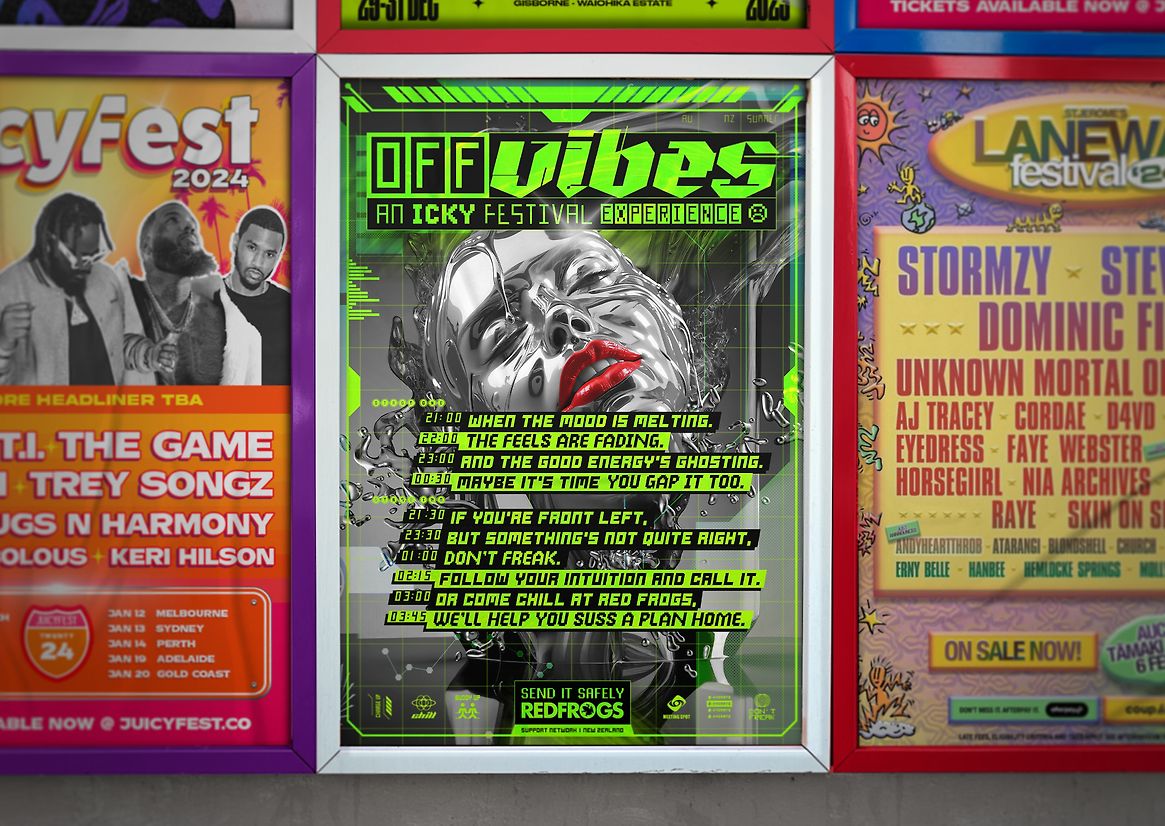Our campaign launched a few weeks before New Year’s Eve 2024 and ran right through the summer. Event advertising at the festivals reminded patrons of the messages they had seen on the streets, as well as being shared through Red Frogs social media channels.