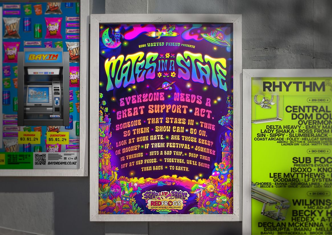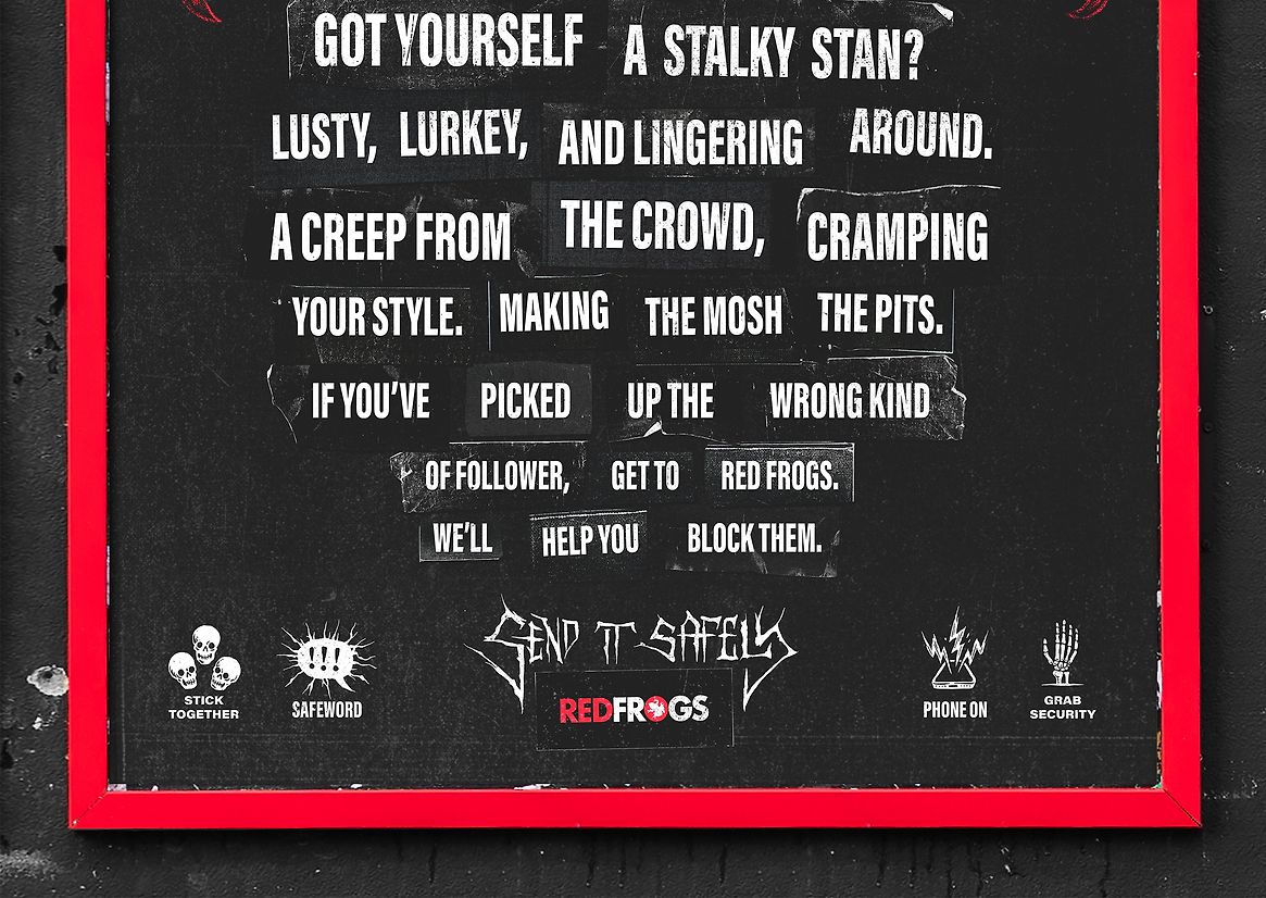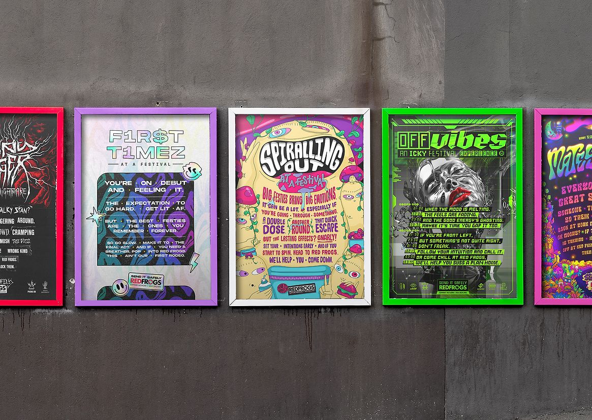 In the lead-up to summer, promoters plaster our streets with event advertising. So we placed our safety messages amongst them, disguised as festival and gig posters. We turned words of wisdom into the full lineup and made sure they knew Red Frogs volunteers were there should they need them.