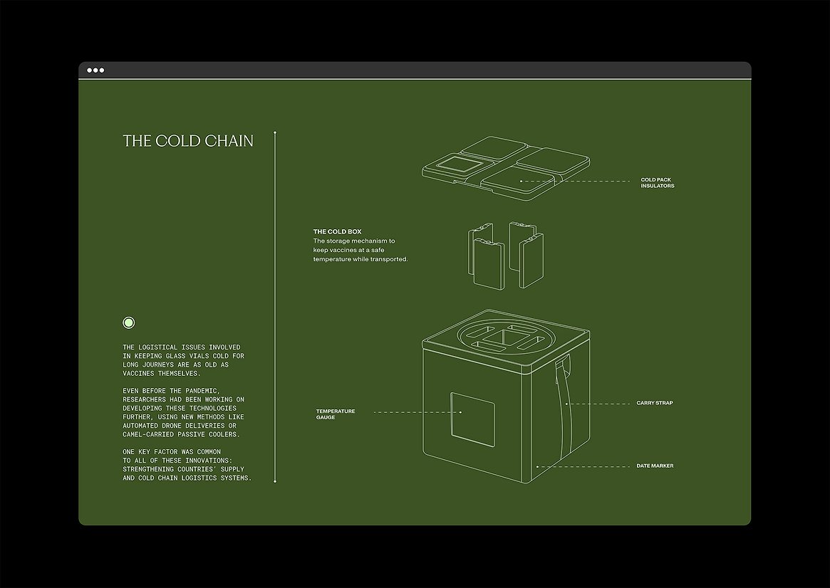 Right from the landing experience, The Delivery takes us on an extraordinary journey, inspired by vaccine voyages to the world's most remote locations. To bring this to life, we developed a robust design system that incorporates an earthy colour palette, intuitive UI elements that lead the user through the data-led stories, and elegant typography that will stand the test of time.