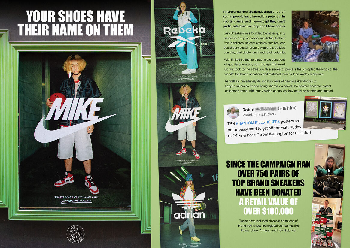 The street poster campaign ran in three high profile sites (with daily foot traffic of over 20,000) in Wellington, in April 2022. As fast as the posters could be put up, they were photographed, shared and “collected” by sneaker lovers (an astonished Phantom Billstickers publicly congratulated “Mike and Becks” for their dedication in carefully detaching the notoriously hard-to-remove street posters). And shoe donations poured in. Since the campaign ran, in May and June alone, more than 750 pairs of top brand sports shoes have been donated, with a retail value of over NZ$100,000. These have included sizeable donations of brand new shoes from top sports shoe companies such as Puma, Under Armour and New Balance.