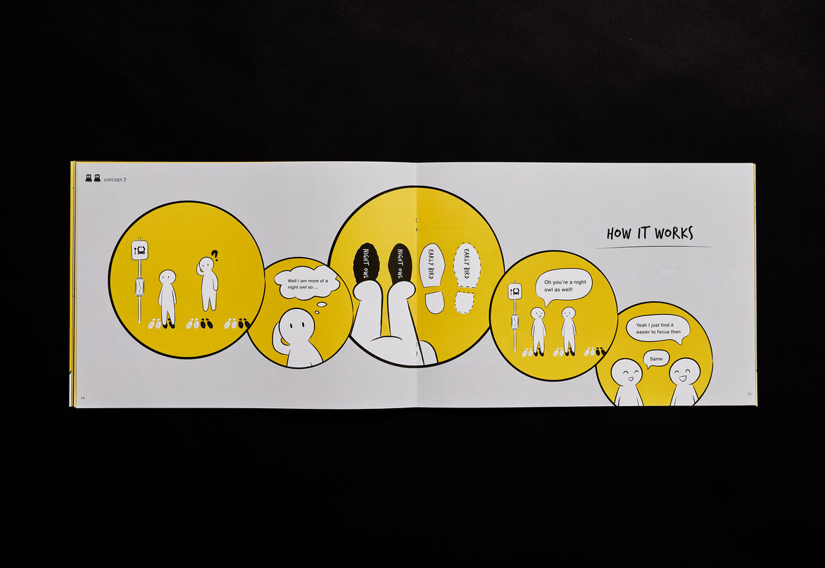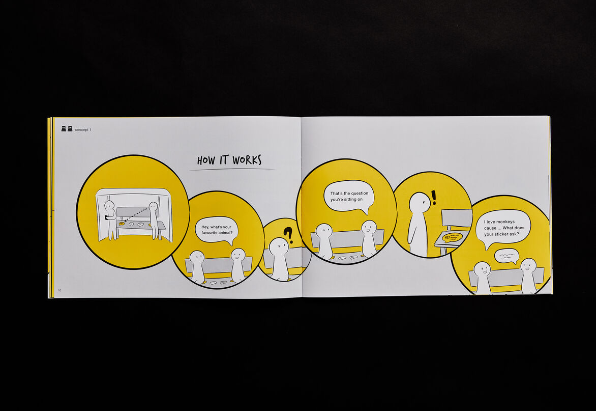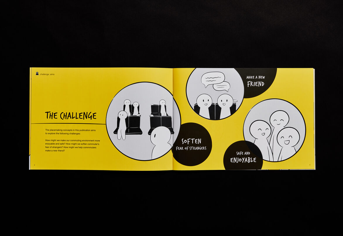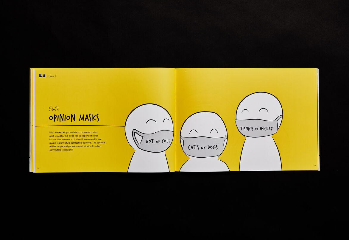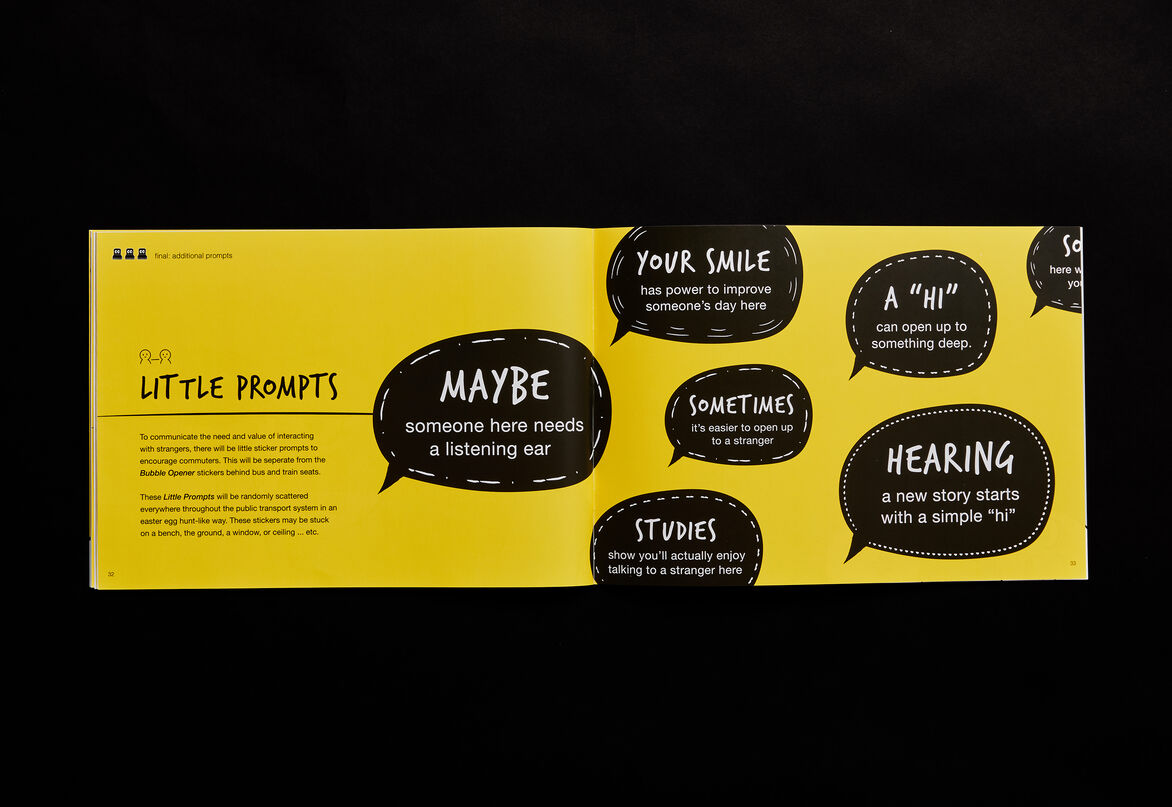 Concepts in Bubble Openers aim to help make commuting more enjoyable and safe; providing fun, easy ways to start conversations and connect with fellow commuters. This resource acts as a platform to start reimagining the future experience and interactions of commuters using public transport.