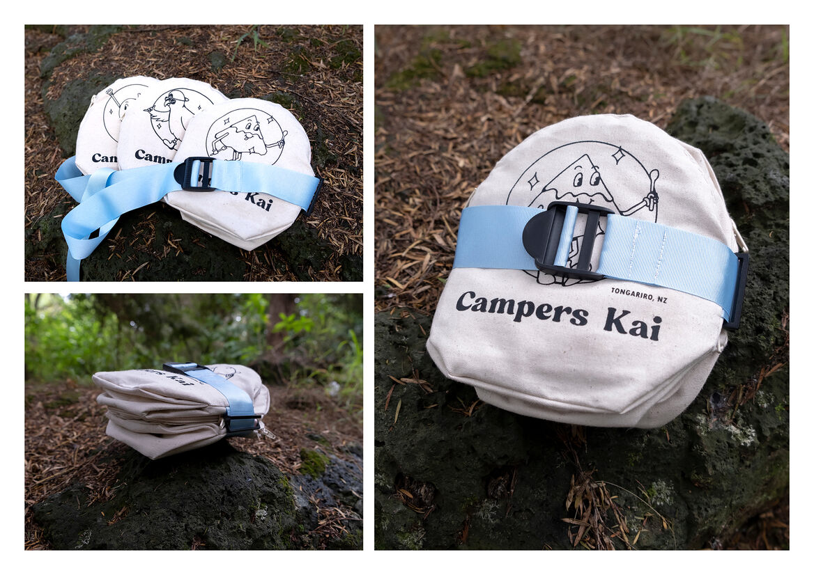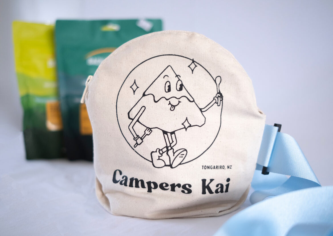 Our natural conservation lands in New Zealand operate on a “pack-in, pack-out” policy. There are no trash facilities provided, and anything taken into our campgrounds or hiking trails needs to be taken out. The most common solution to rubbish management on hikes are zip lock or plastic bags. These carry out the baseline function of storage rubbish on the trail while being light and compressible. Still, many users have issues with leakages, smells, and the overall rubbish management experience. Camper’s Kai is a combination of service and product that aims to reduce the amount of single-use packaging taken into our protected natural environment. The service provides freeze-dried food and hiking snacks in a “refillery” style. A user would be able to take in reusable storage of their choice (containers or bags) and fill them up from various bulk bins. The freeze-dried food offered can come in pre-set meals, also offering a local “meal of the month” special. Alternatively there is a “pick n’ mix” option which lets users select raw ingredients to build their own meals. Additionally, the service offers re-usable branded (with a collectible graphic) pouches that provide a discount on the food purchased at Camper’s Kai. These pouches have been designed to improve a hikers’ user experience of food storage, consumption, and rubbish storage. These can be washed and reused for a hiker’s next trip. For any reason where a user doesn’t want to continue more hiking trips, the pouches can be continued to use as casual bags outside of the system. The reusable pouches are designed to improve the hiking user experience during eating and trash storage. The original packaging for freeze-dried meals are typically in soft plastic packs that can be difficult to hold once filled with hot water. It is also relatively tall, with a narrow opening that makes it difficult to access and scoop food comfortably. The Camper’s Kai pouch lining is a quilted material that makes it more comfortable for the user to hold hot contents. The pouch is also easier to eat out of due to its shorter height and circular opening. Through interviews, it was identified that some hikers use the original freeze-dried food packaging as their trash storage, eliminating the need to bring extra bags for trash. Camper’s Kai pouches took that lead user innovation, encouraging that behaviour within their systems and pouch. The double-sided label identifies what’s in the pouch, what type of meal or if it’s being used to store trash. Furthermore, the inner sleeve can be removed and washed after trash storage.